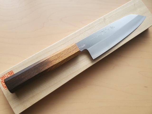 【鍛冶田中義一】三徳黒打ち 両刃 白二 6寸 樫八角柄(刃付け丸山忠孝)贈答用桐箱入り