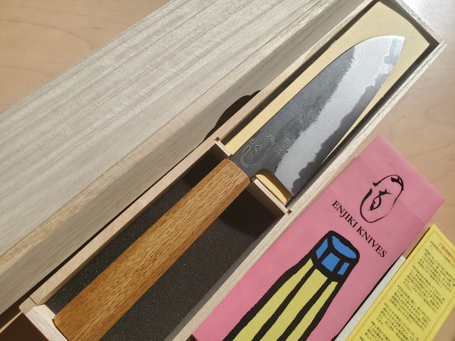 • 【鍛冶田中義一】三徳黒打ち 両刃 白二 6寸 樫八角柄(刃付け丸山忠孝)贈答用桐箱入り