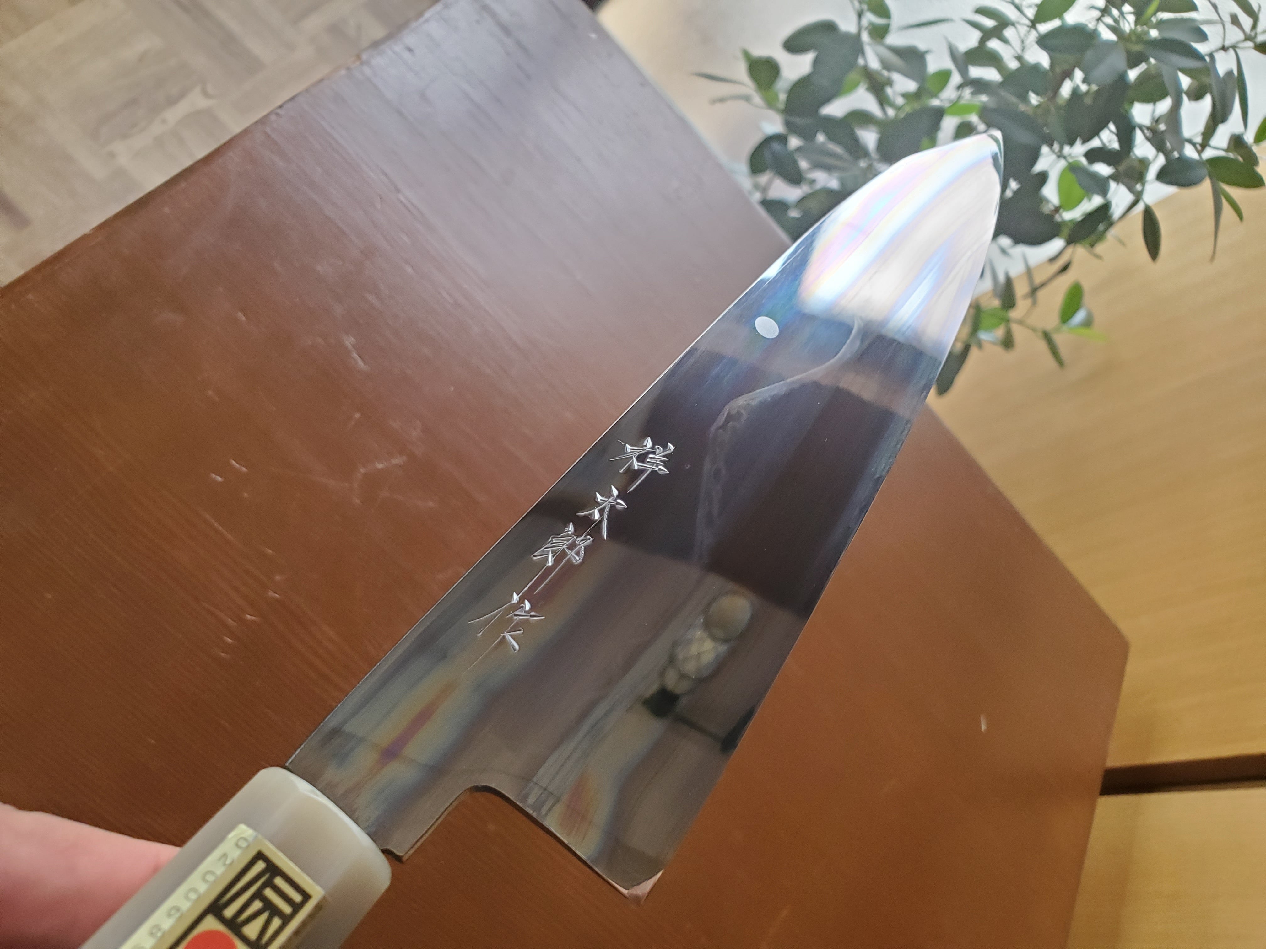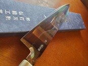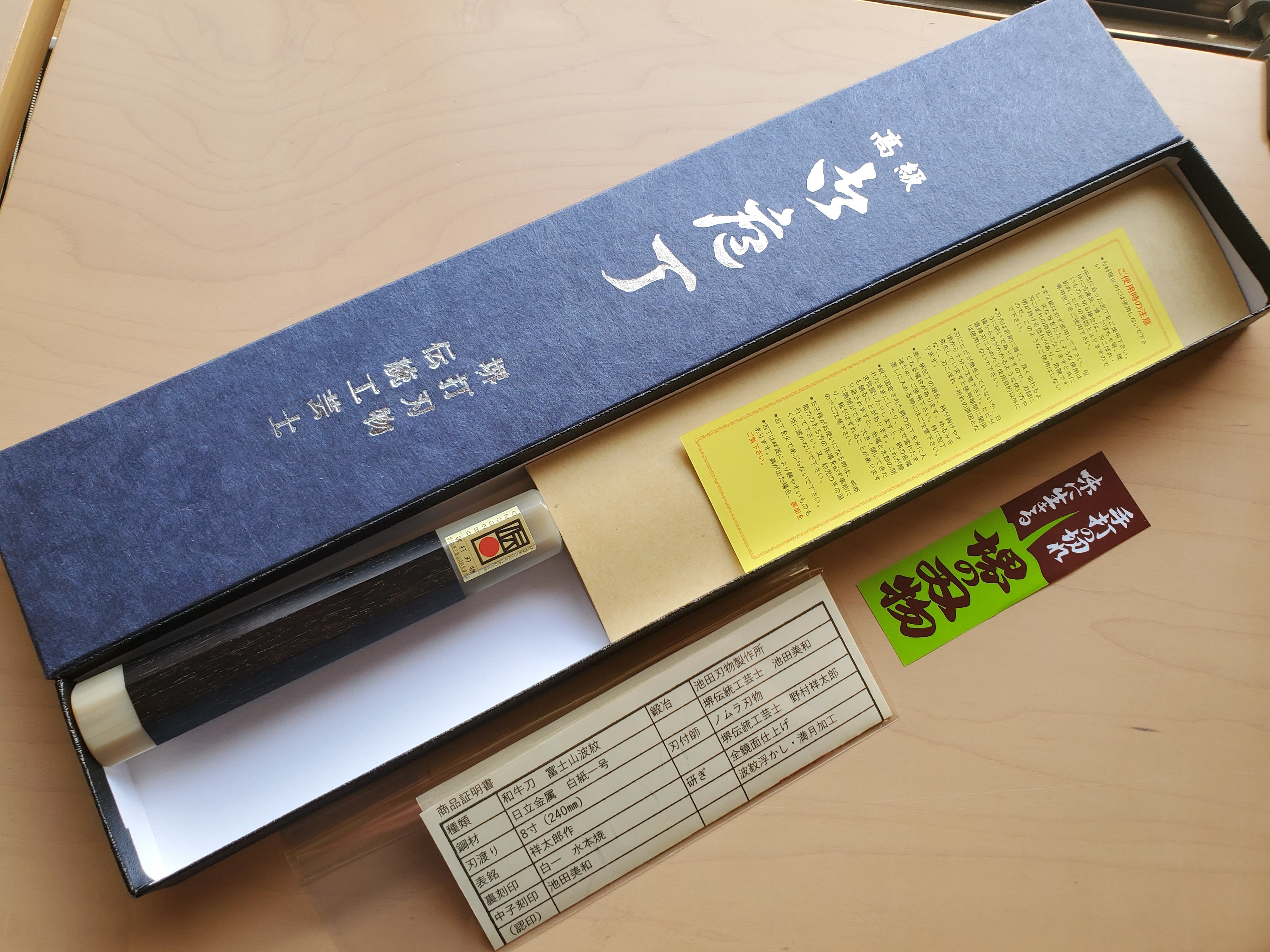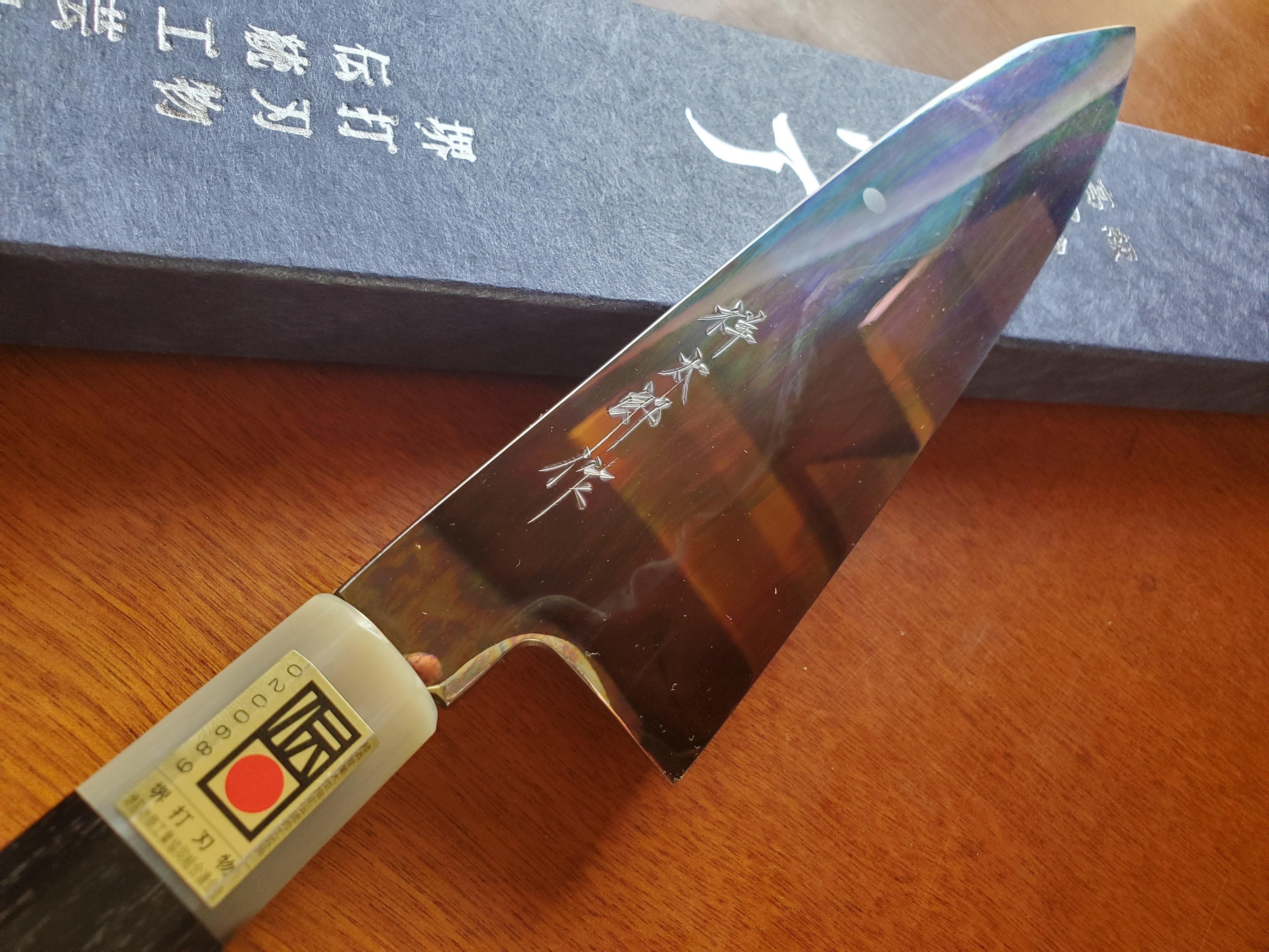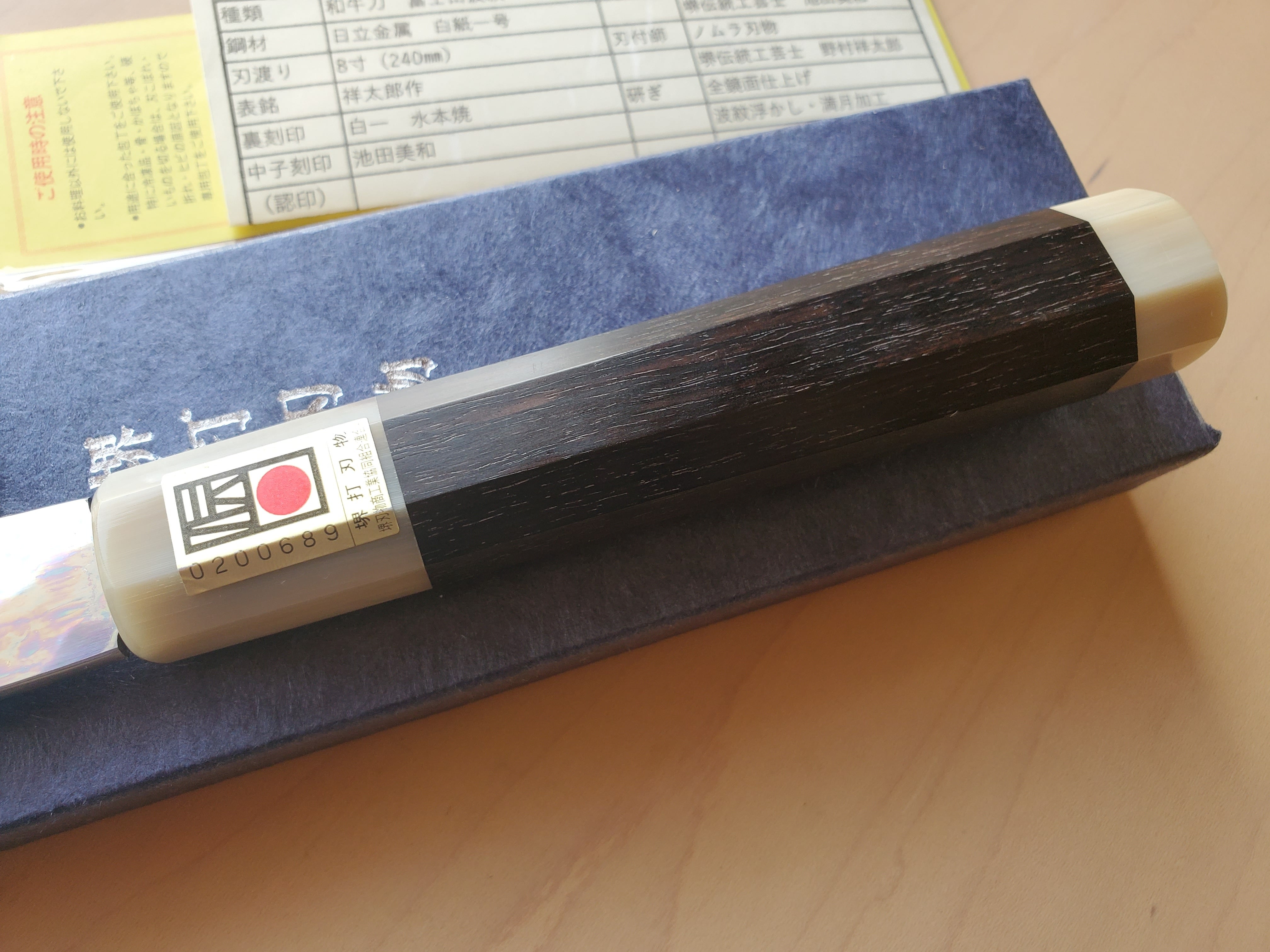 両段白水牛角黒檀八角柄に堺打刃物「伝統的工芸品」を証明する伝統証紙が貼られており、