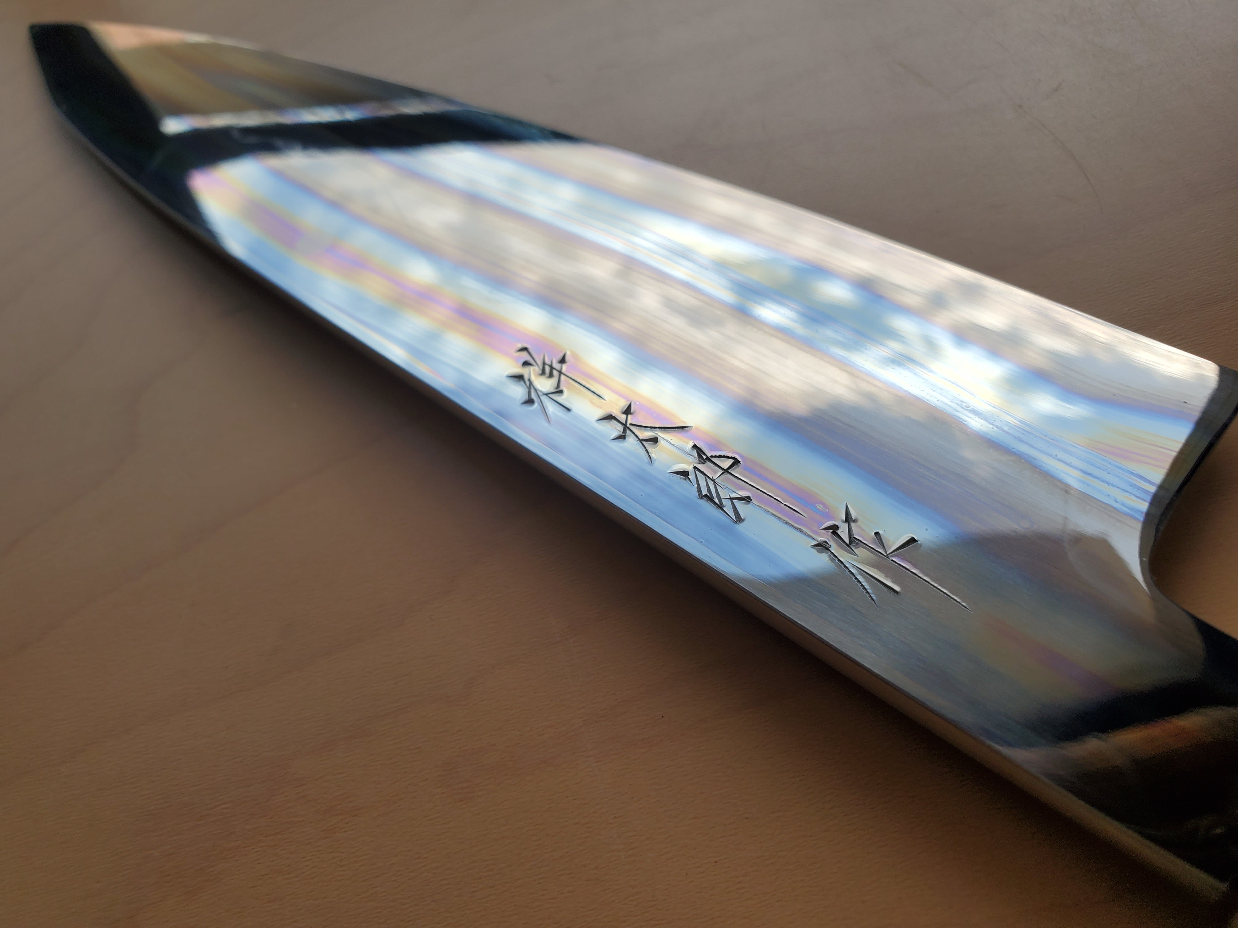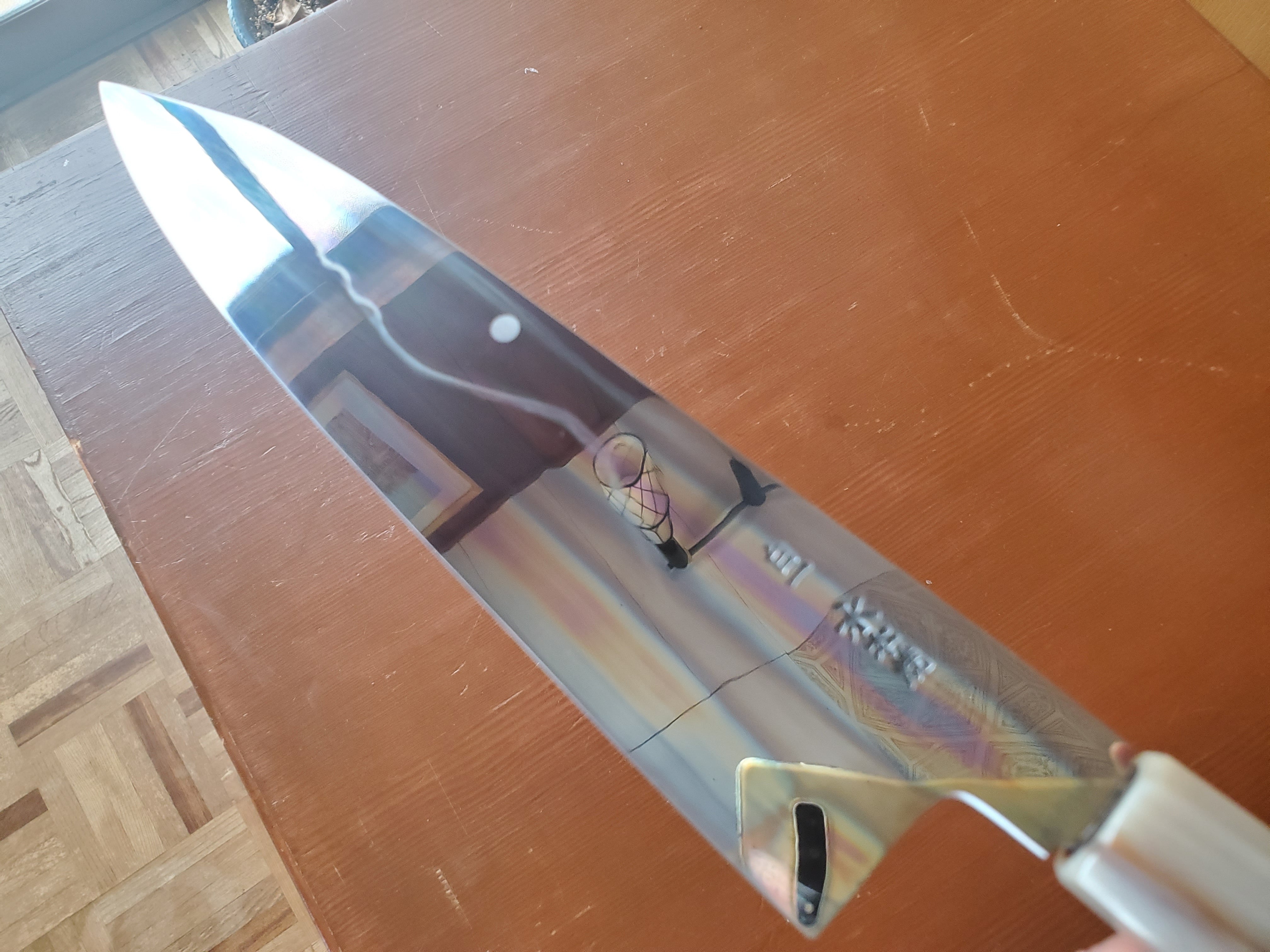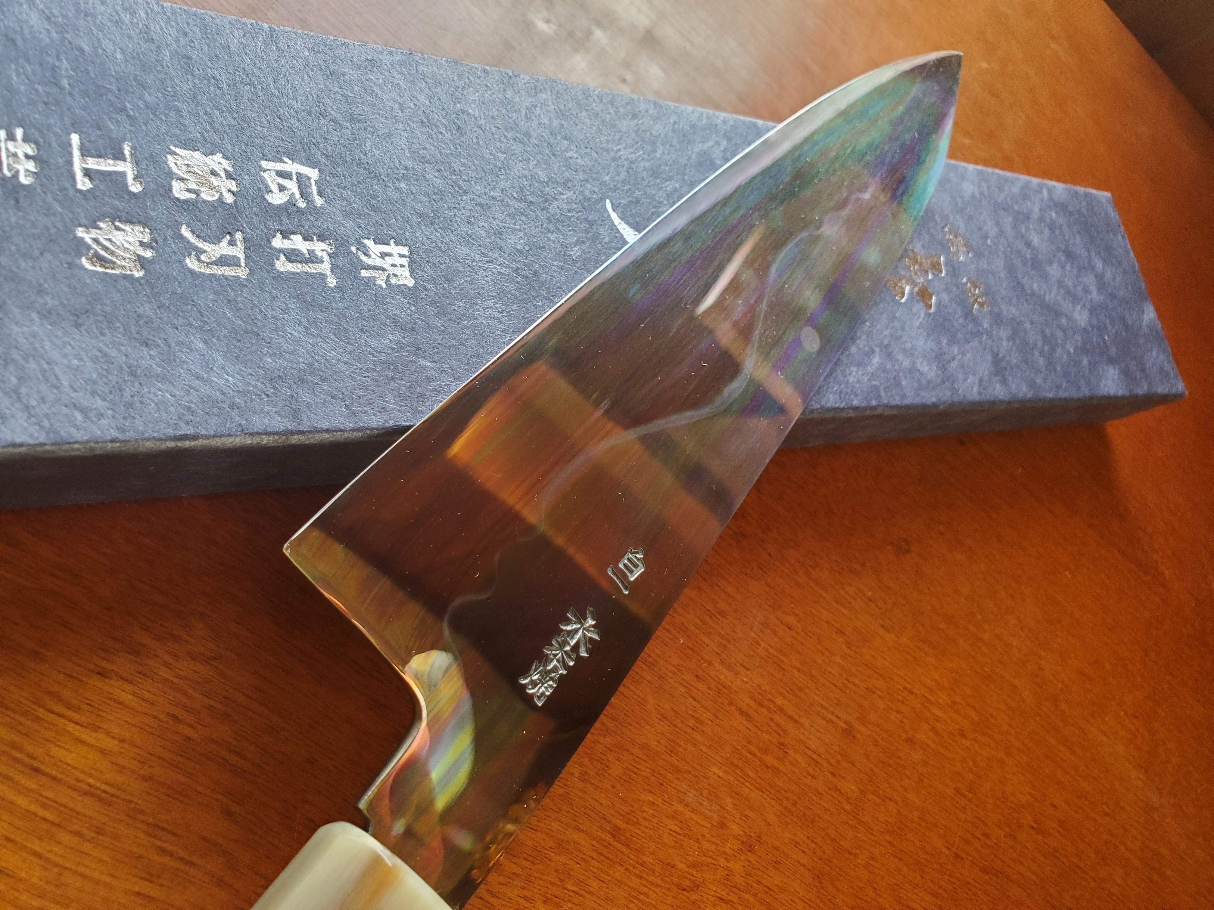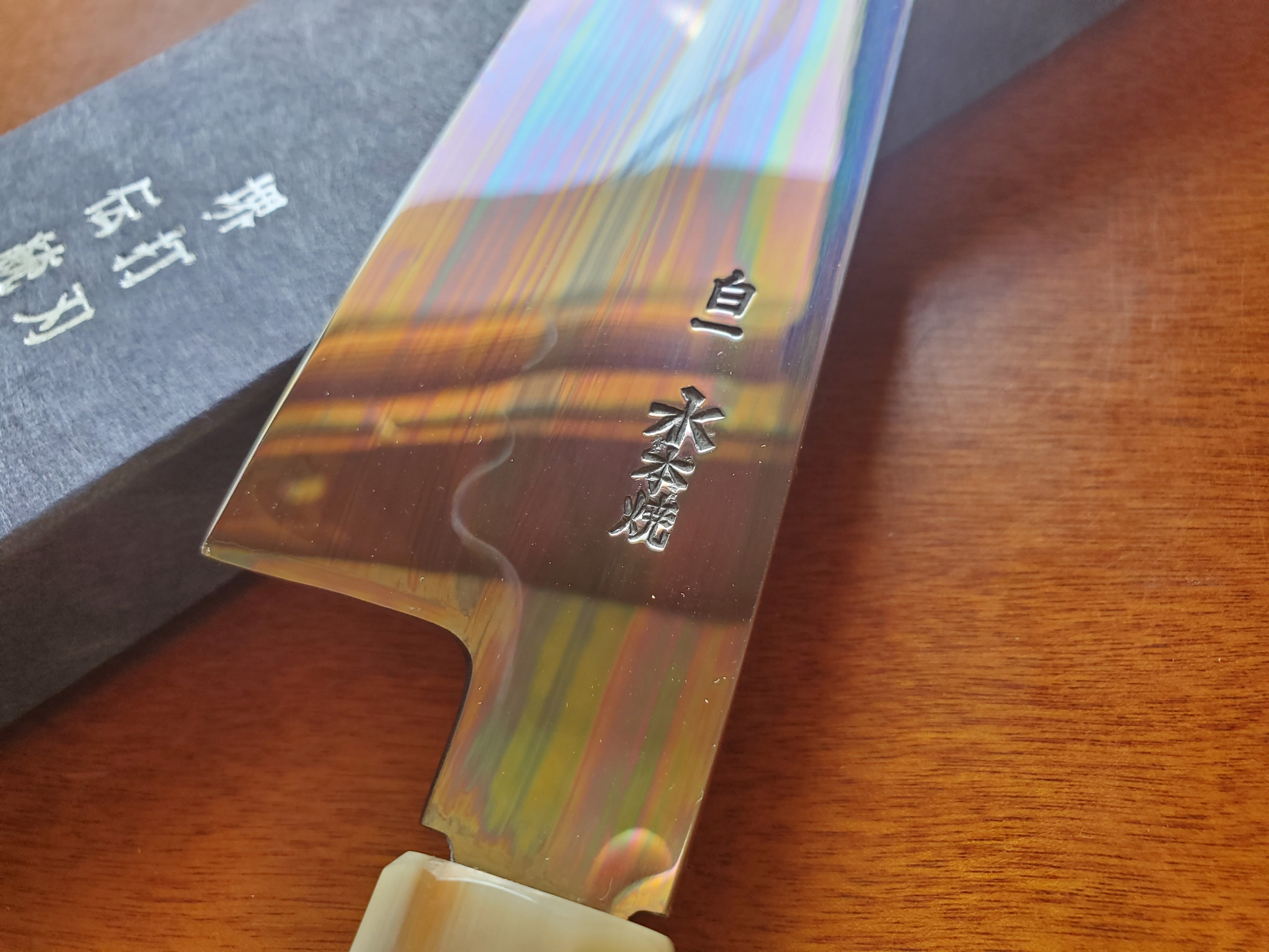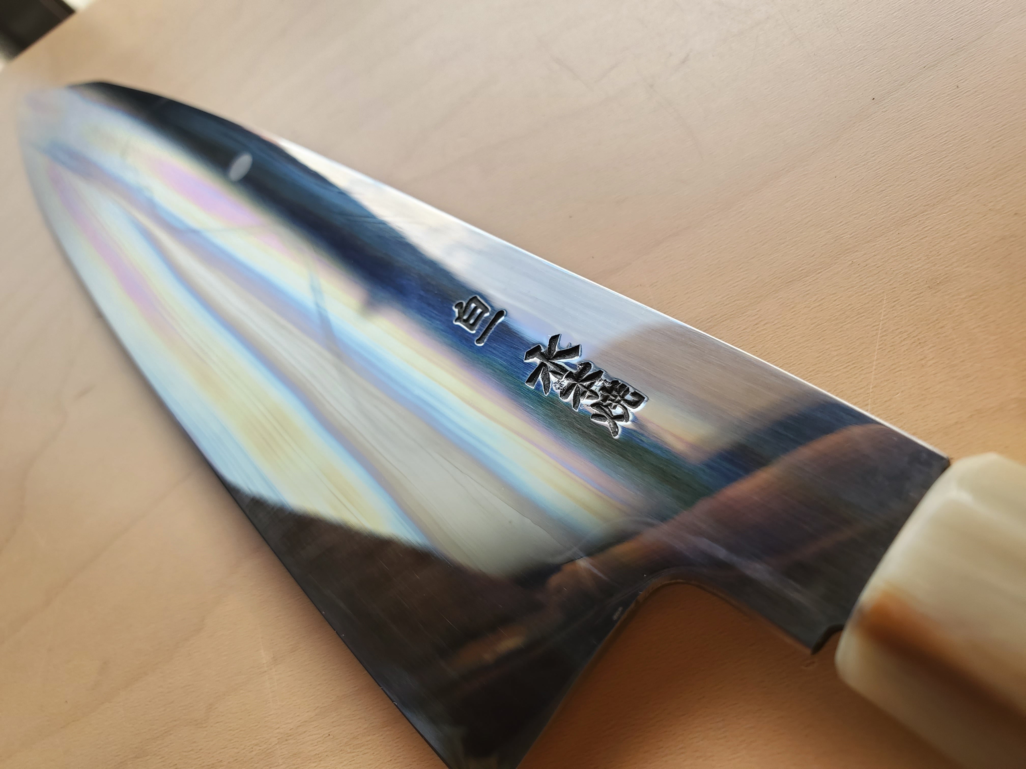 【祥太郎作 水本焼】和牛刀 富士満月波紋 8寸 白1 全鏡面仕上げ(両段白水牛角黒檀八角柄)