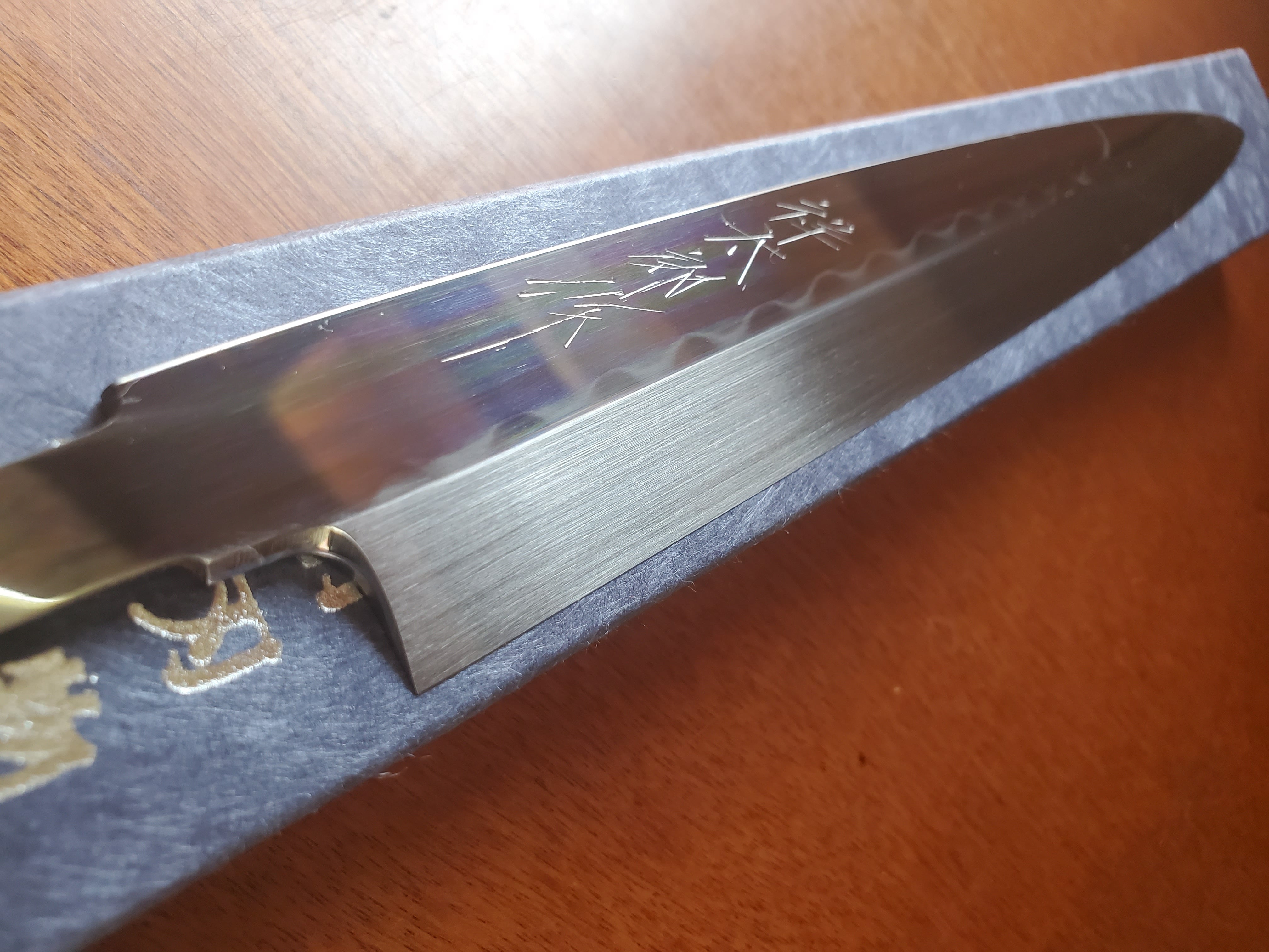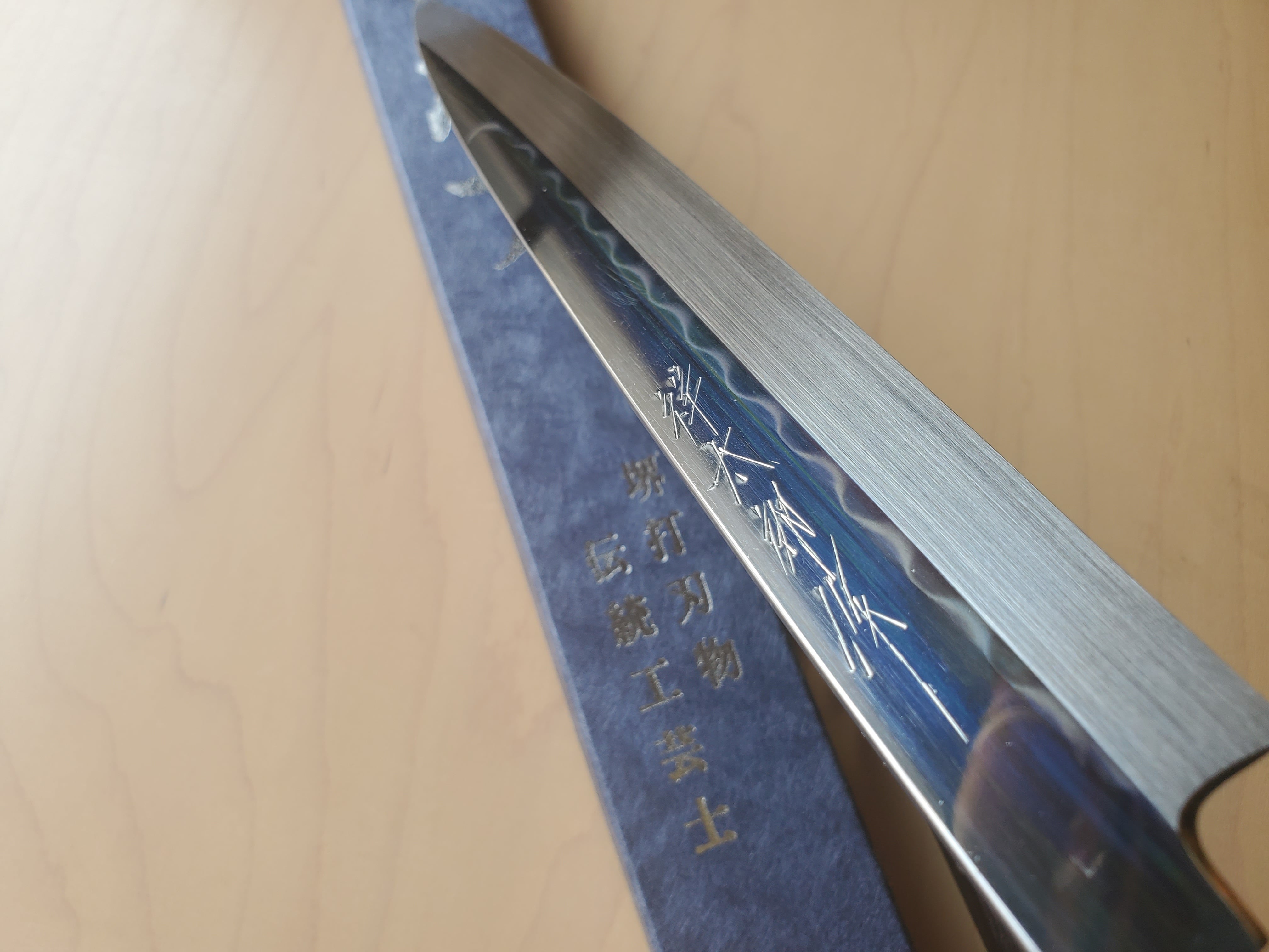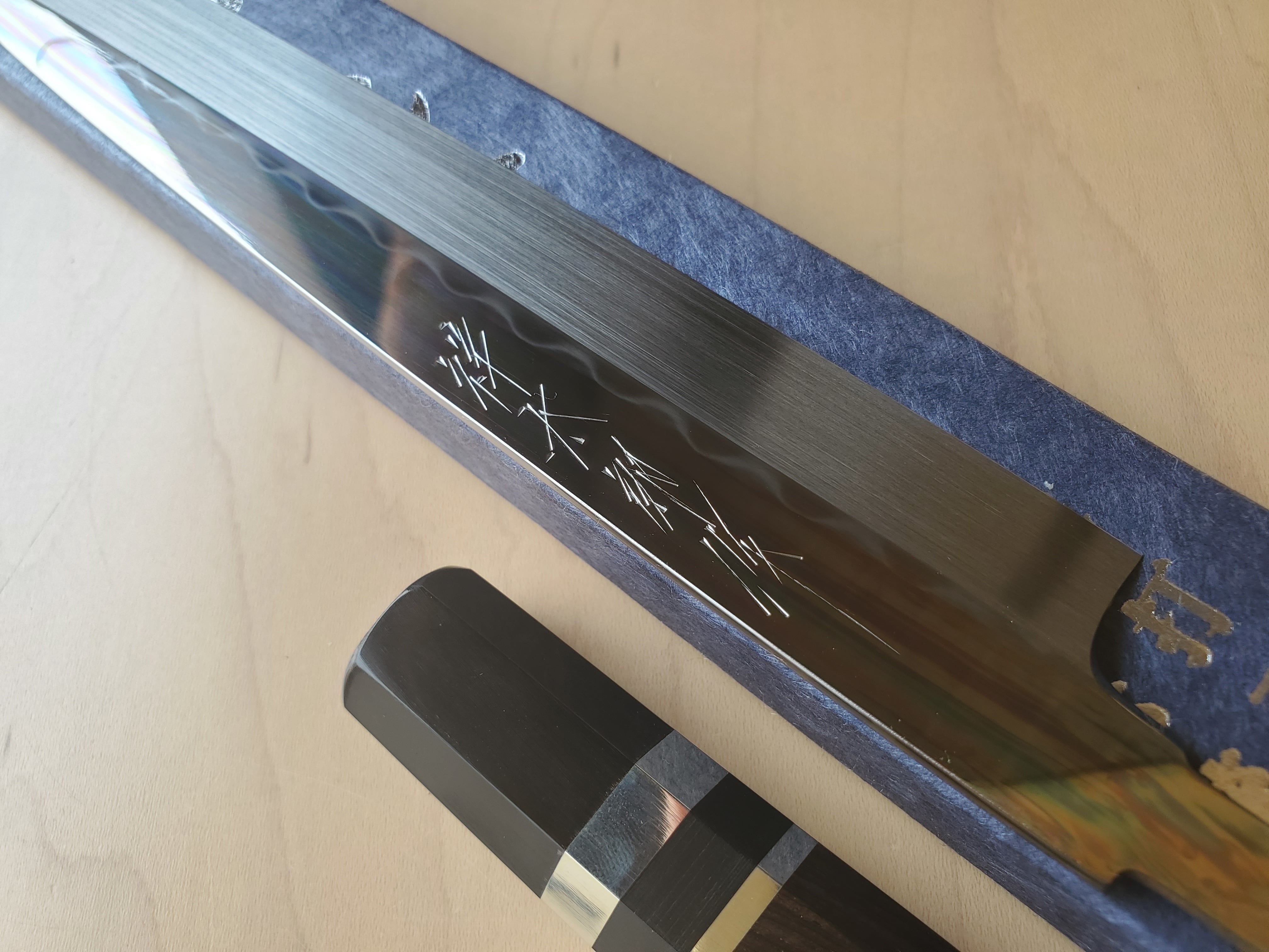 研ぎは堺伝統工芸士 野村祥太郎氏 が平鏡面、切刃手木砥仕上げ、裏はサンドブラストに仕上げた逸品で波紋も綺麗に出ております。