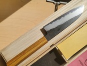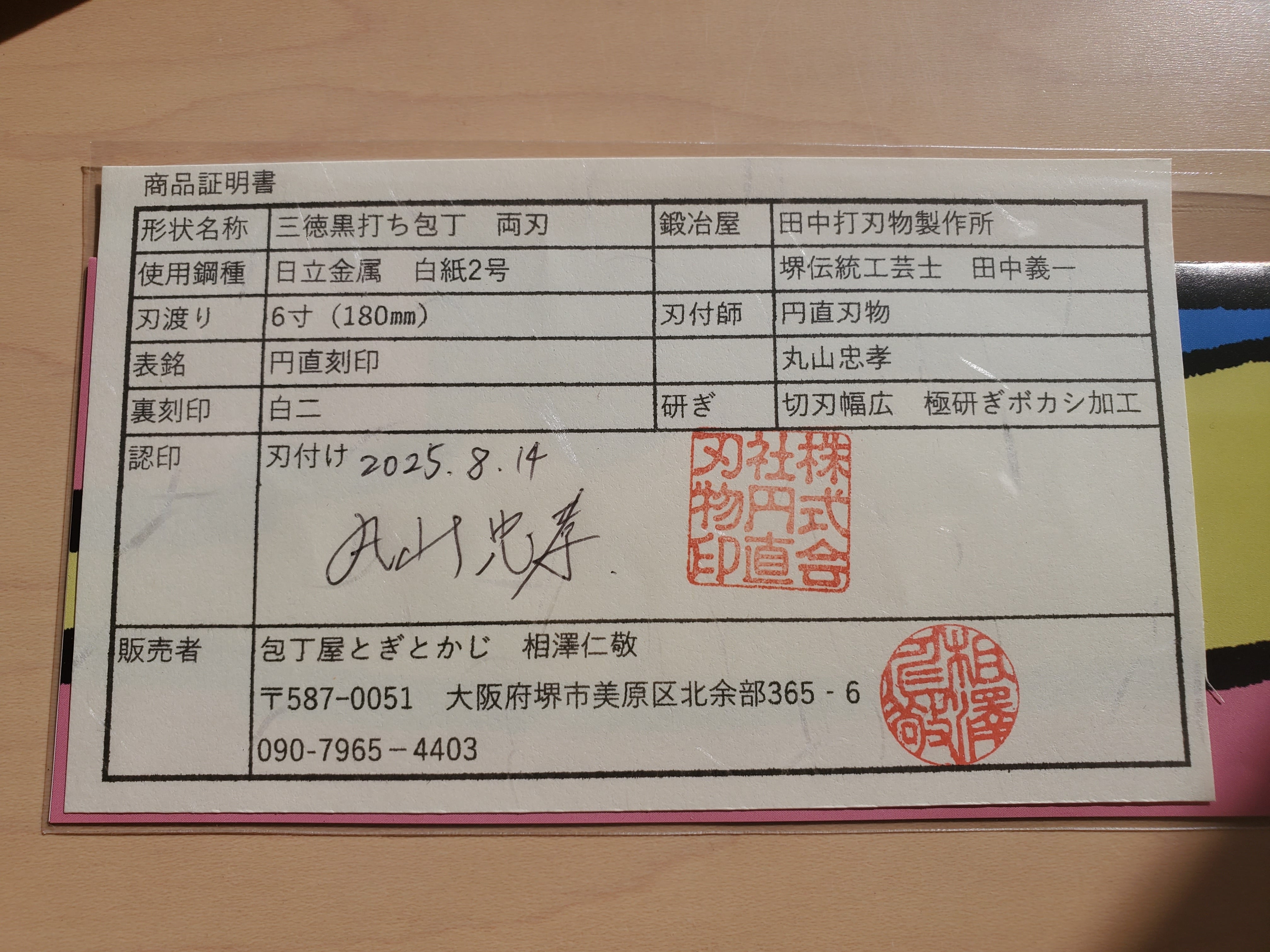 丸山氏は刃物の本場堺で腕を磨き、海外で人気の高い「刃道」ブランドの牛刀を手掛けて来た職人で研ぎは極上です、今回(丸山忠孝氏)のサインが入った簡易証明書もお付けしておりますので安心してご購入頂ける商品かと思います。