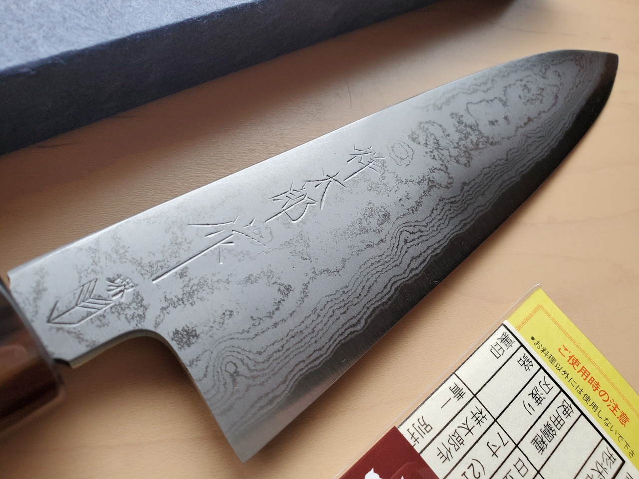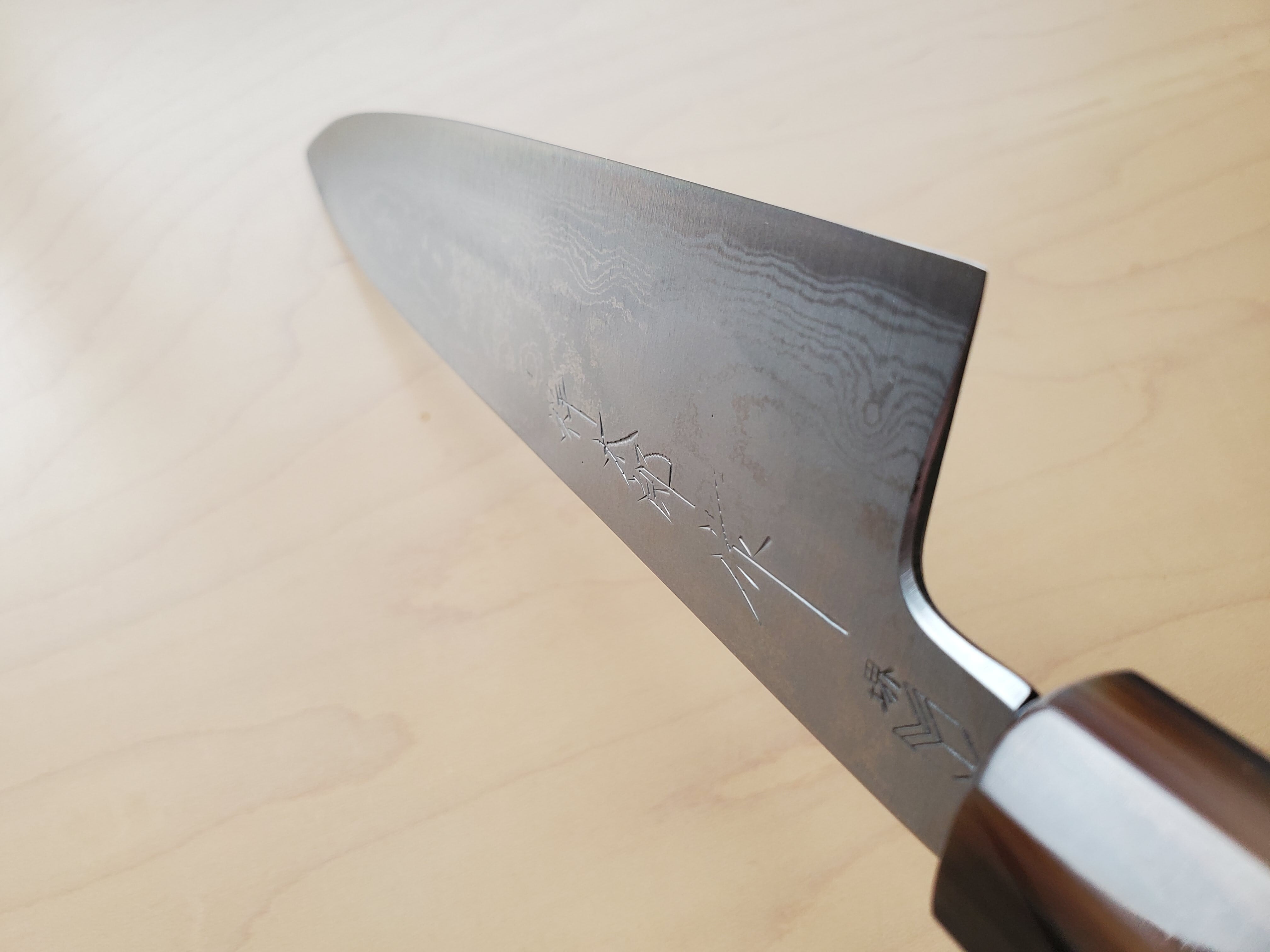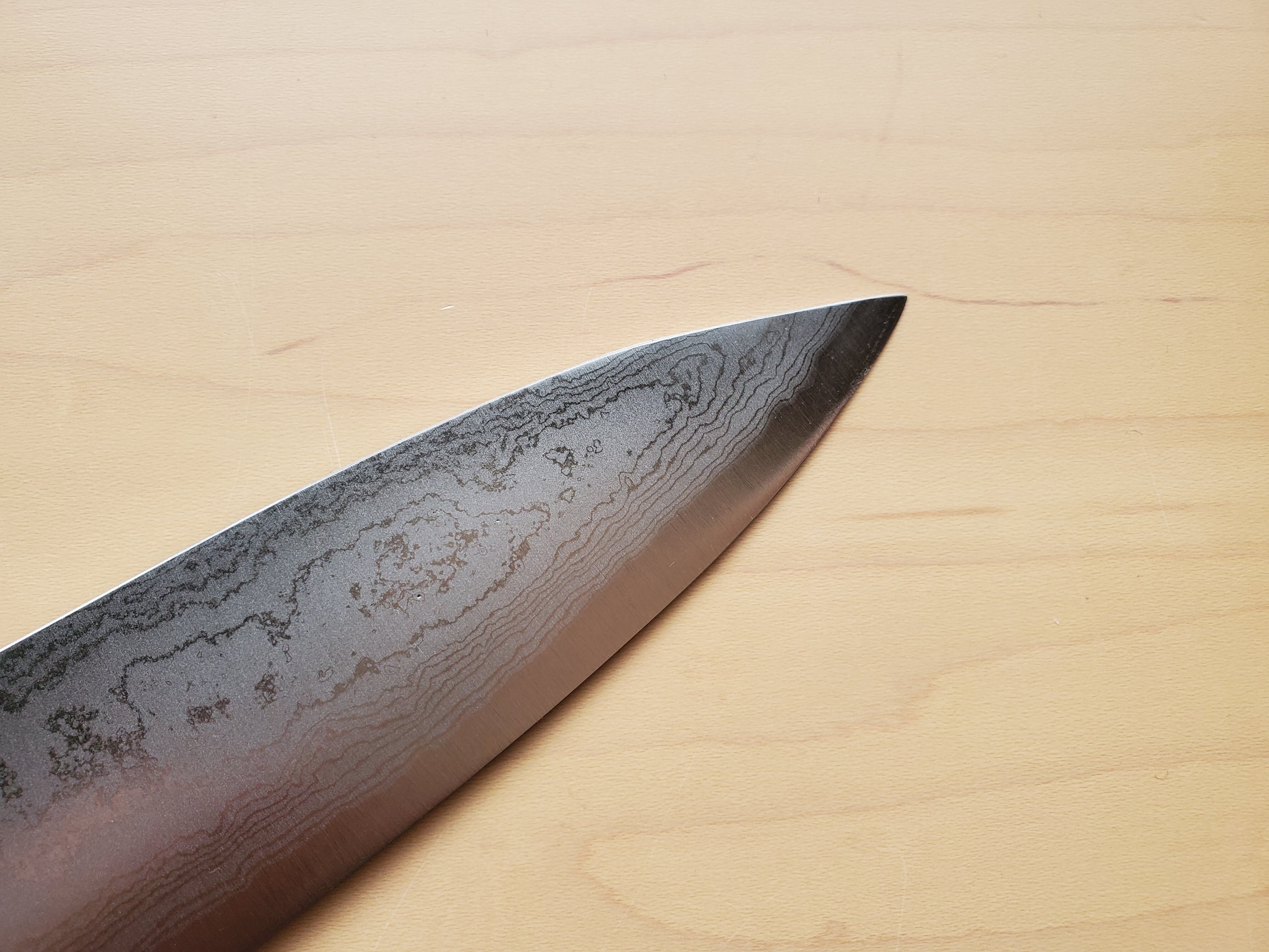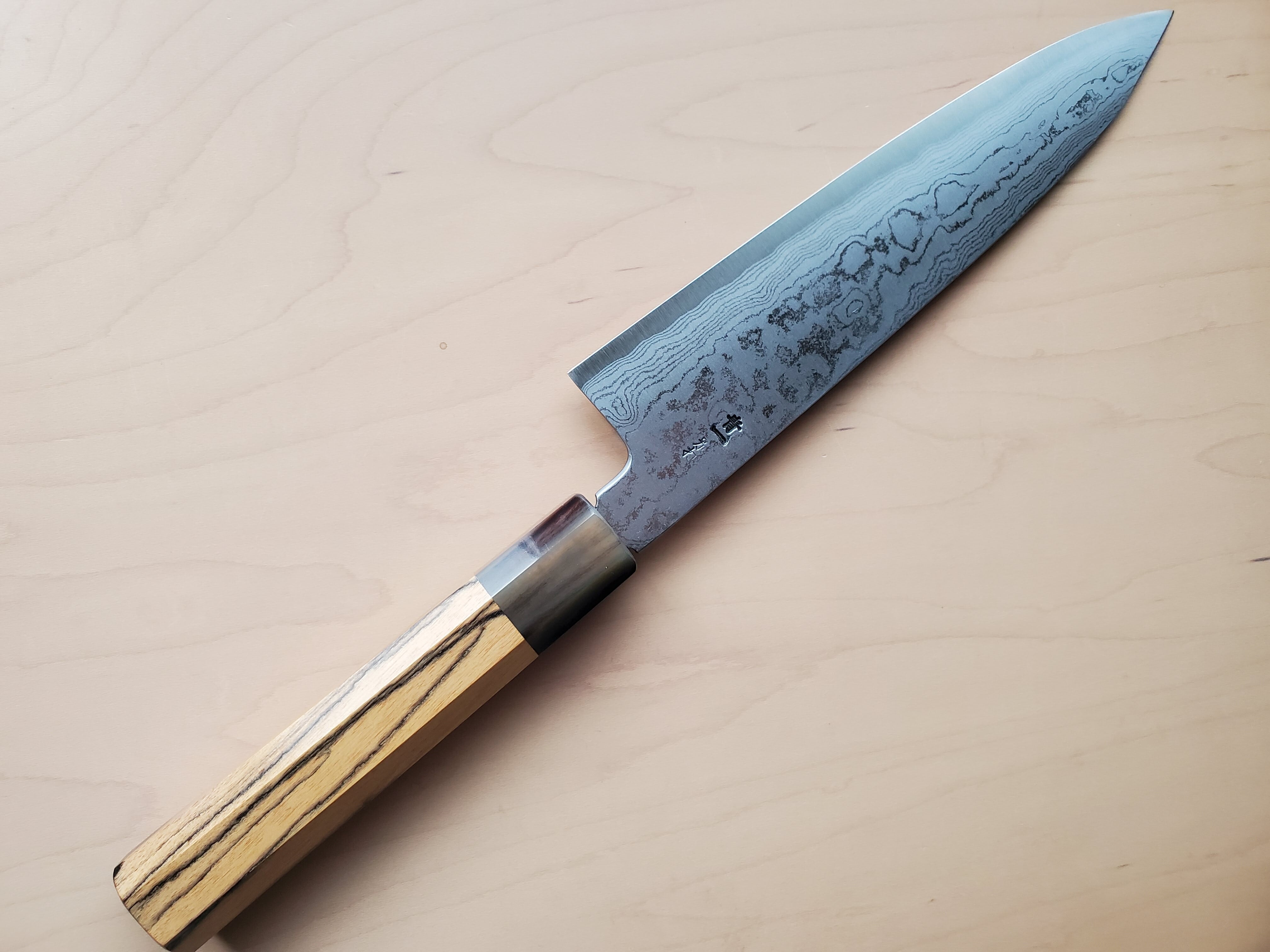 日立金属青紙一号を芯材に使用した墨流し(ダマスカス模様)の和牛刀で