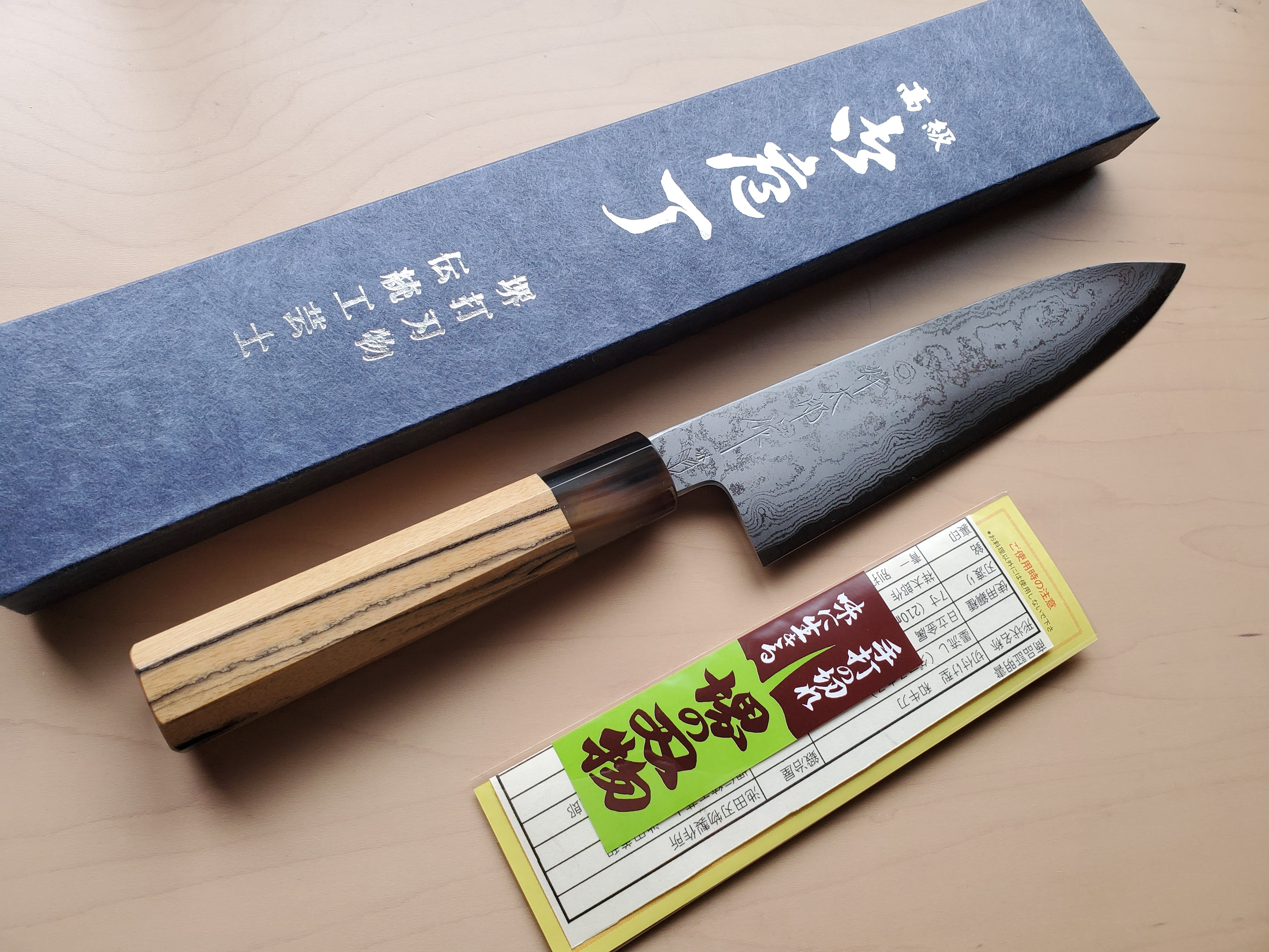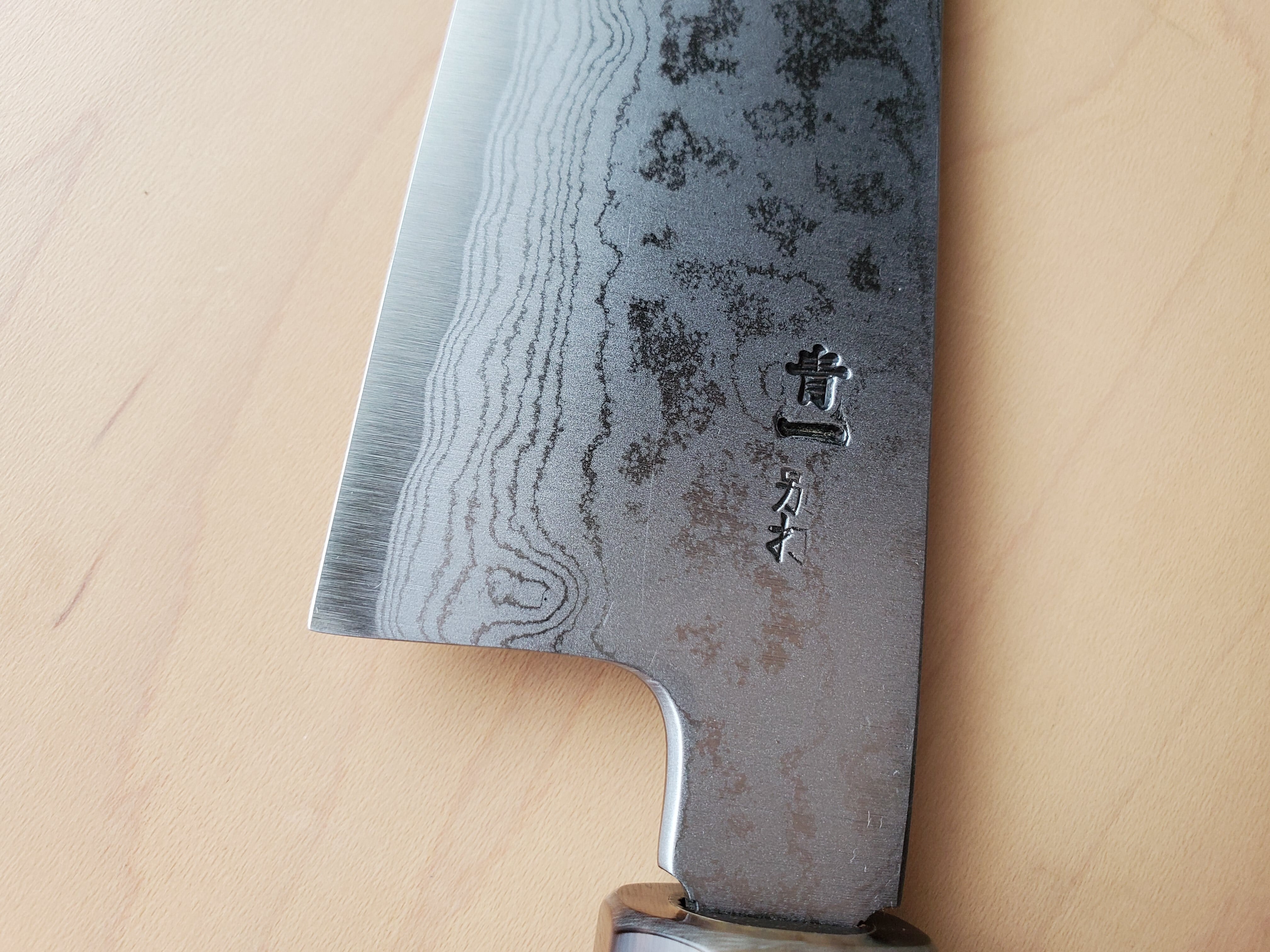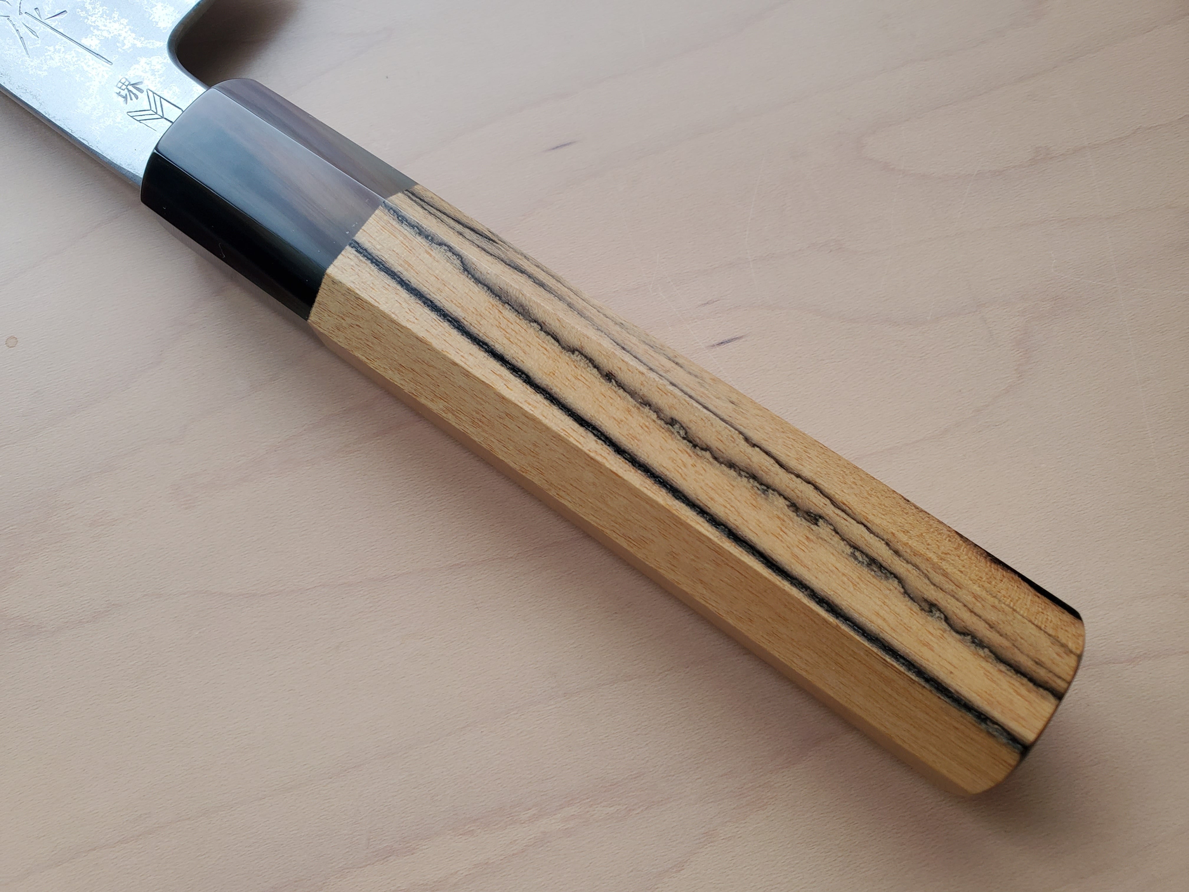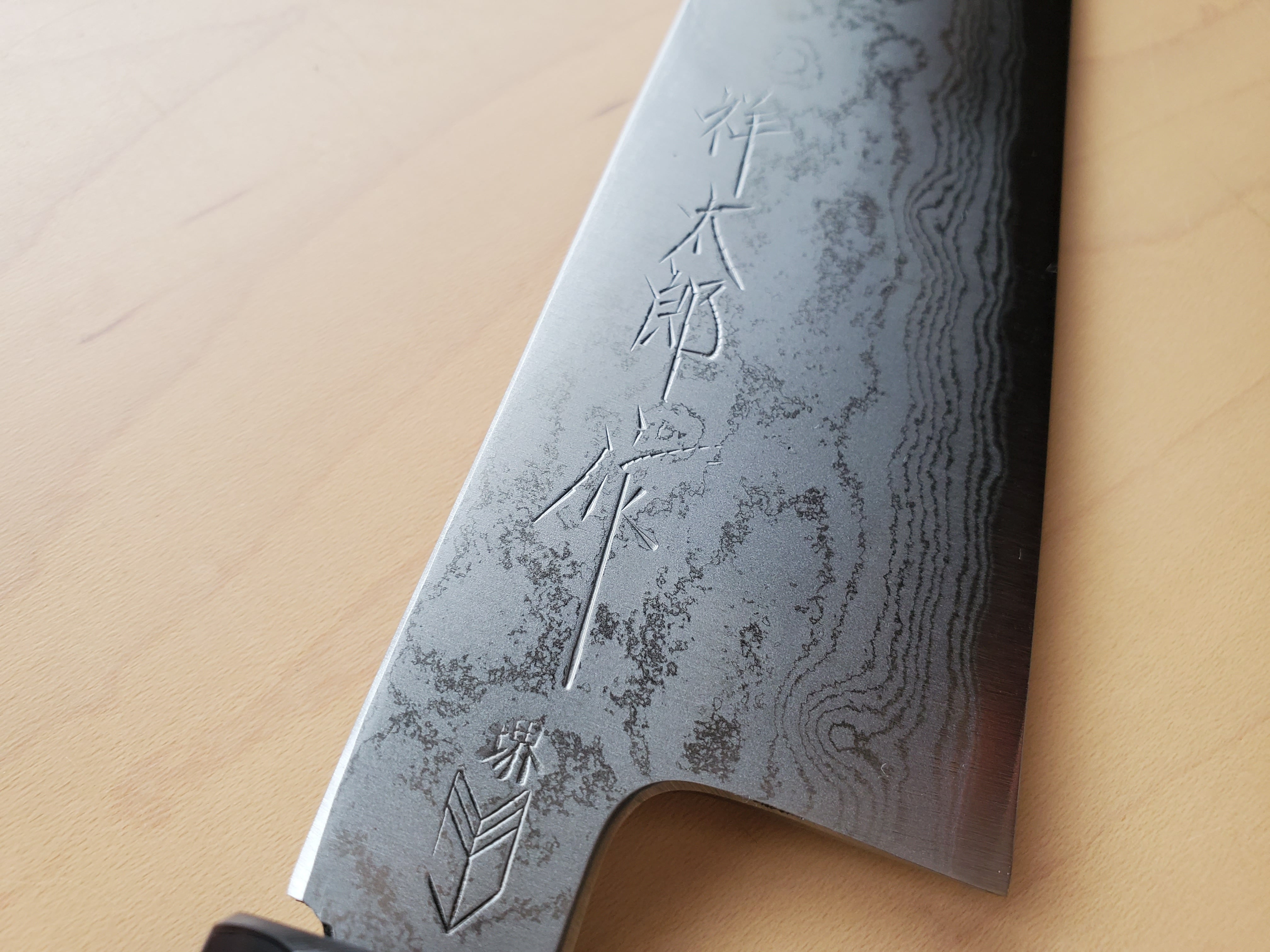 日立金属青紙一号を芯材に使用した墨流し(ダマスカス模様)の和牛刀で