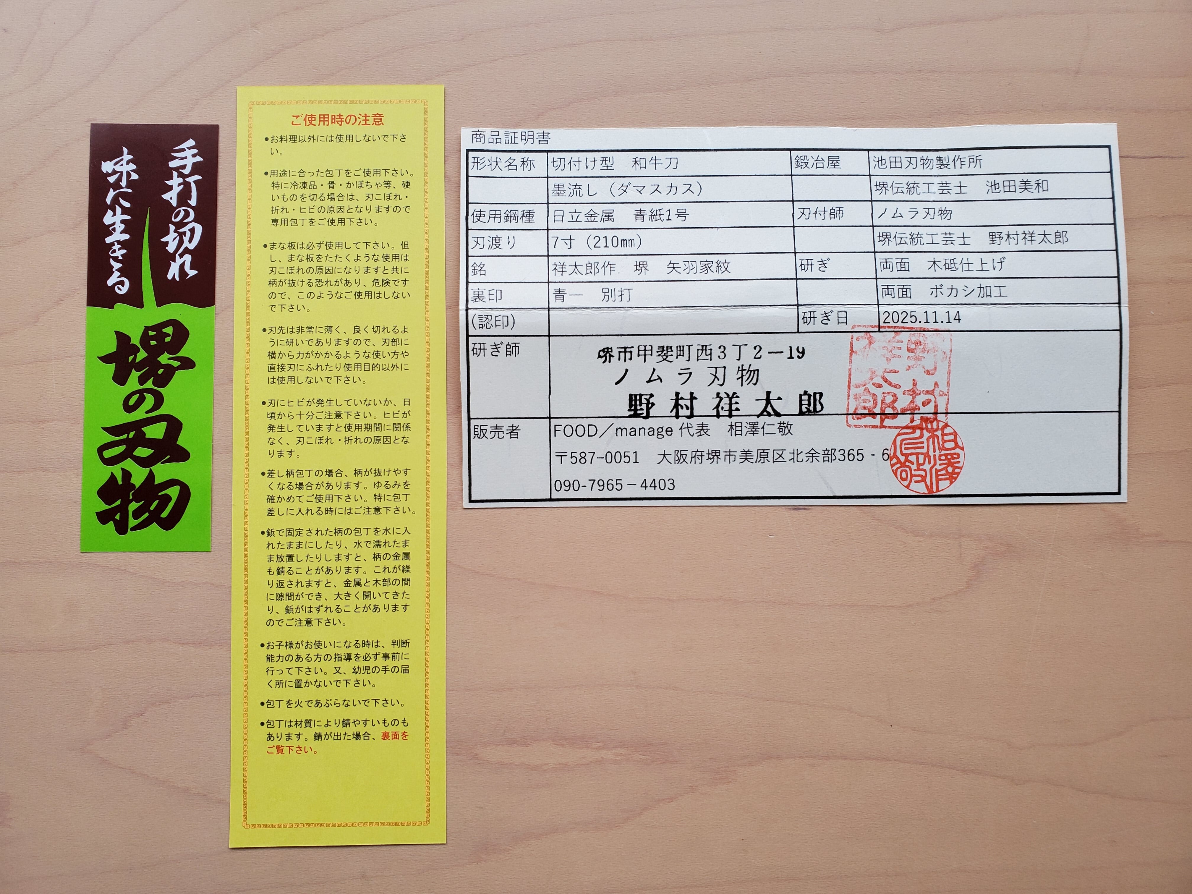 鍛冶 池田美和氏、研ぎ 野村祥太郎氏、お二人の伝統工芸士が手掛けた職人技が光る逸品で表の銘は「祥太郎作」堺 矢羽家紋、裏は青一 別打になっております。