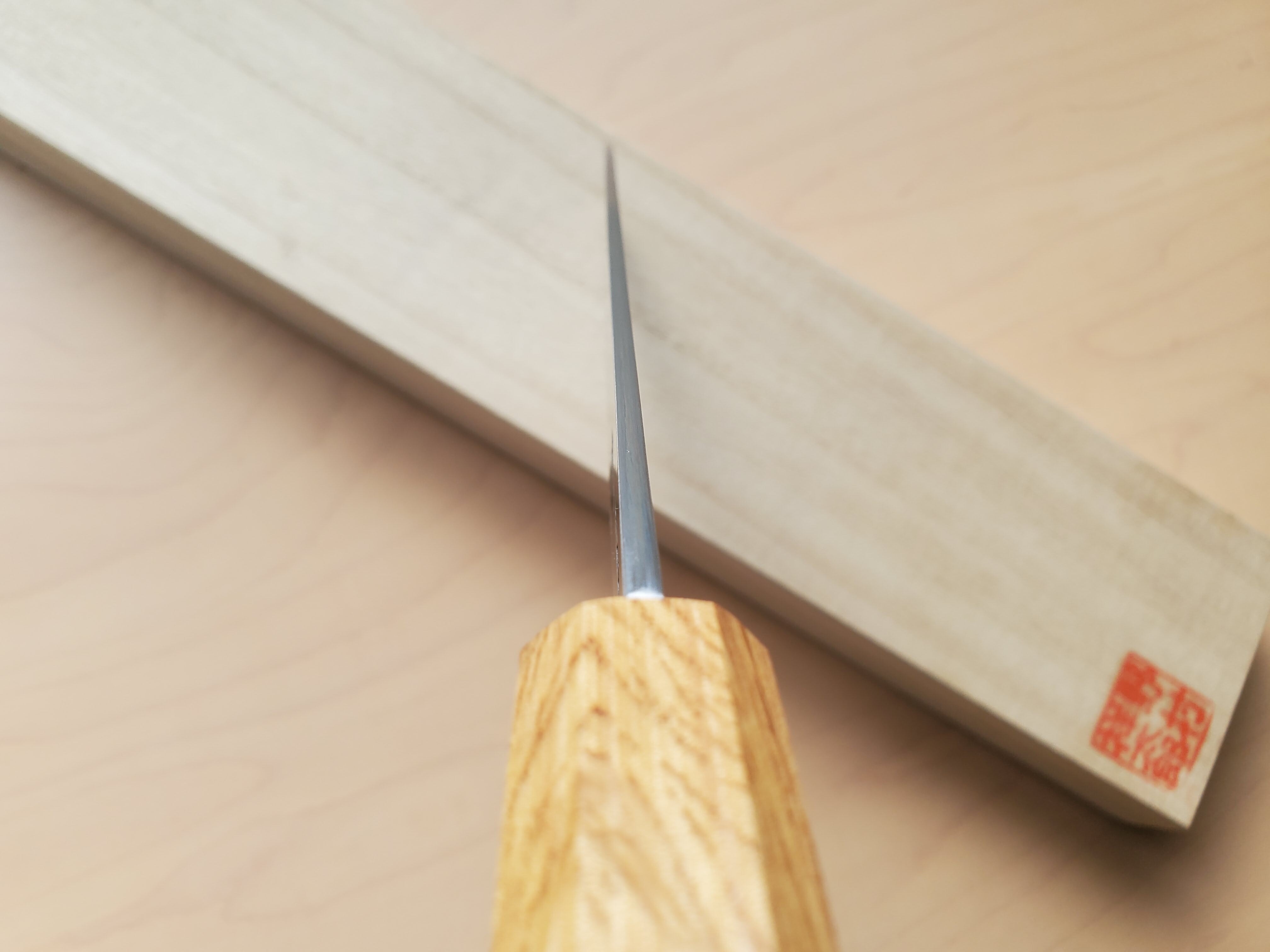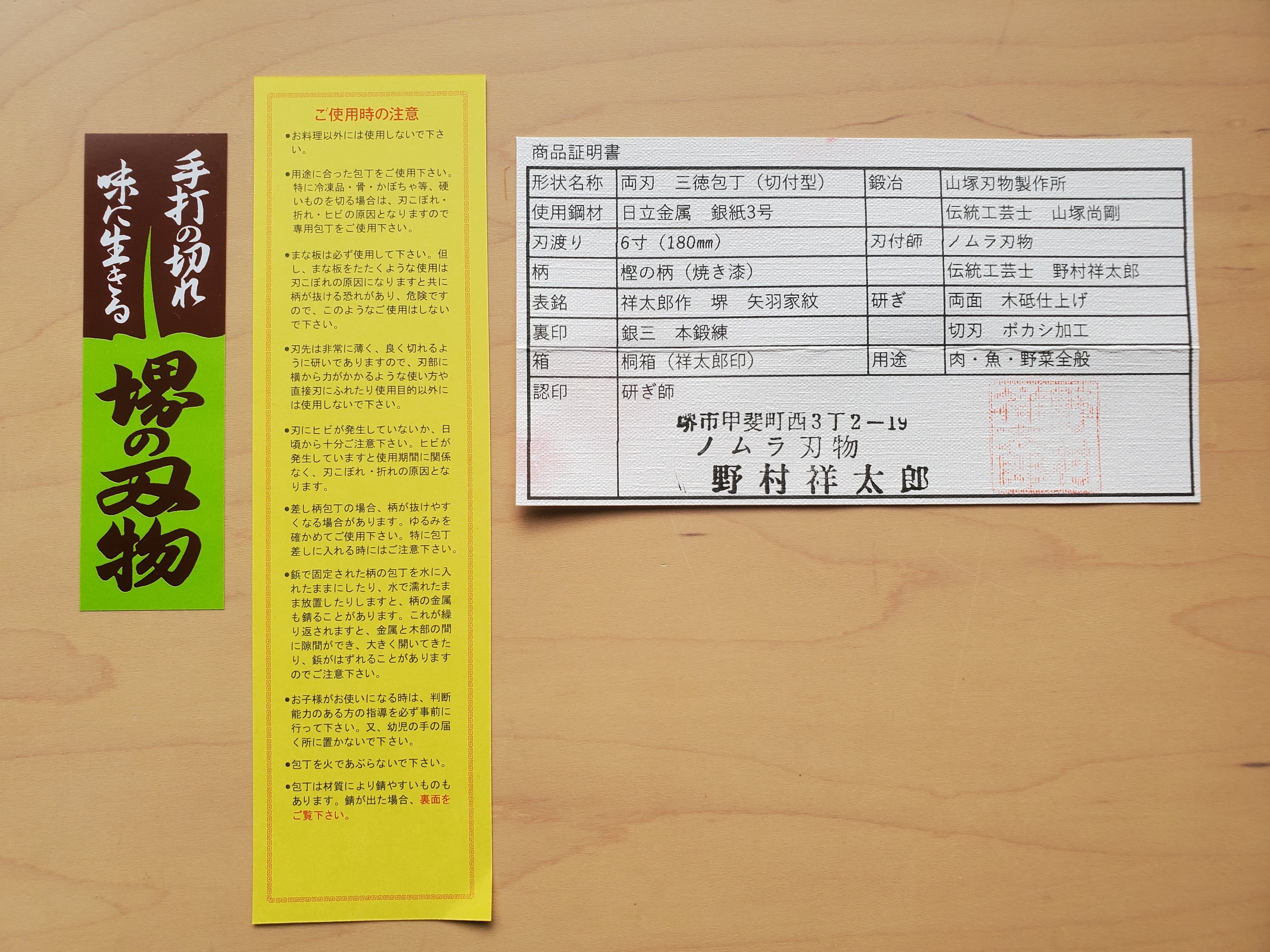 鍛冶は山塚刃物製作所(山塚尚剛氏)、研ぎは野村祥太郎氏、共に堺伝統工芸士が手掛ける職人技が光る逸品で柄は水に強い樫の八角柄(焼き漆)を使用しています。