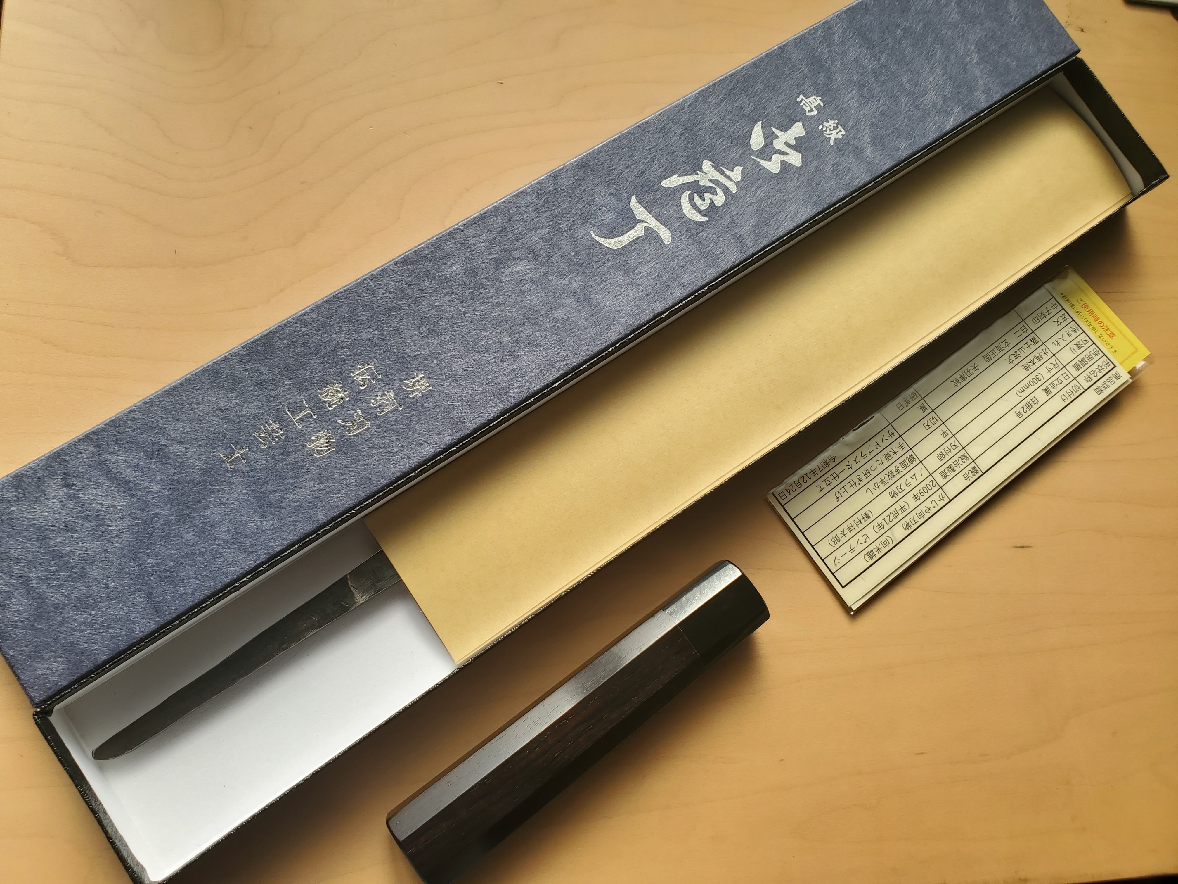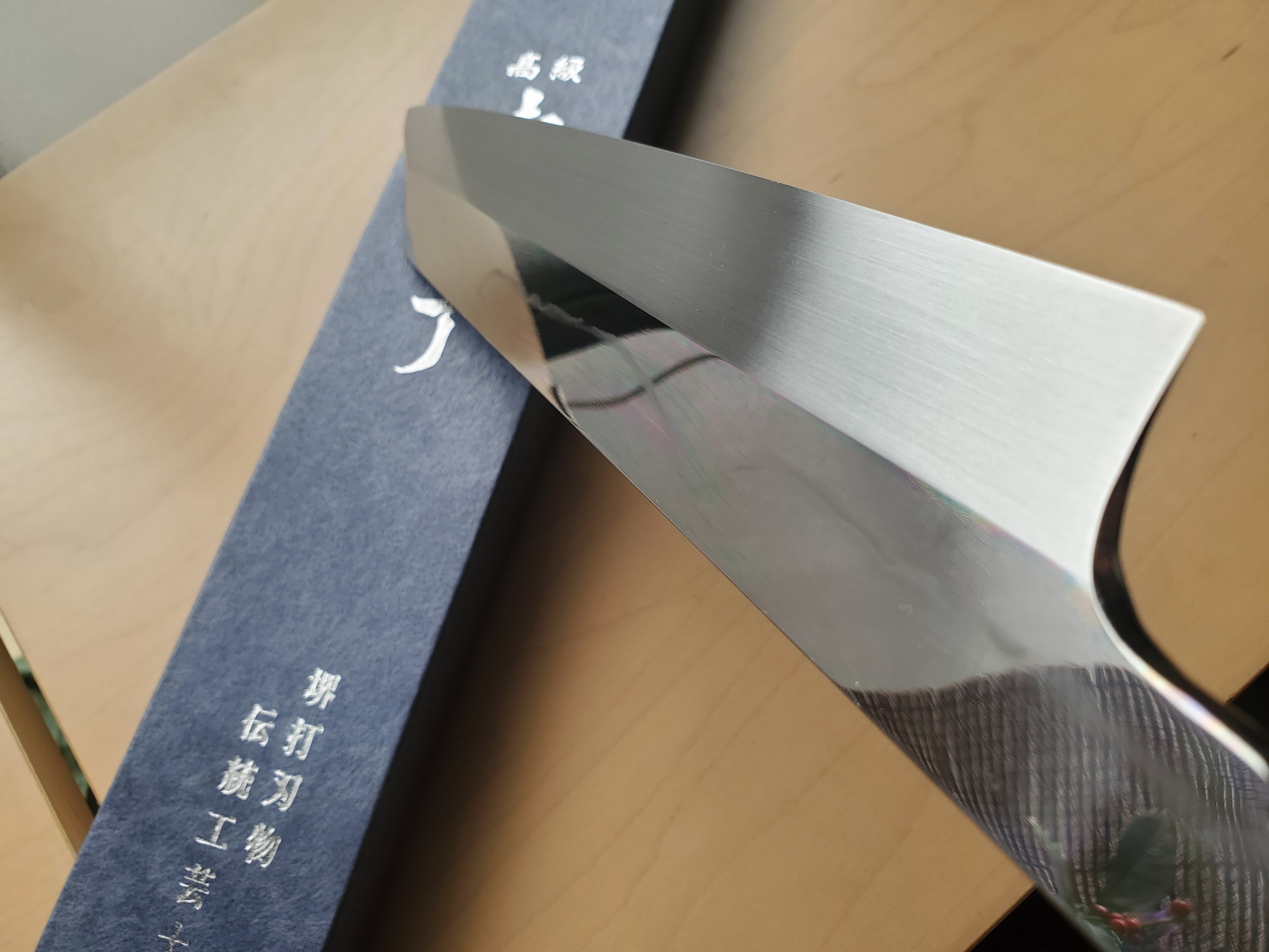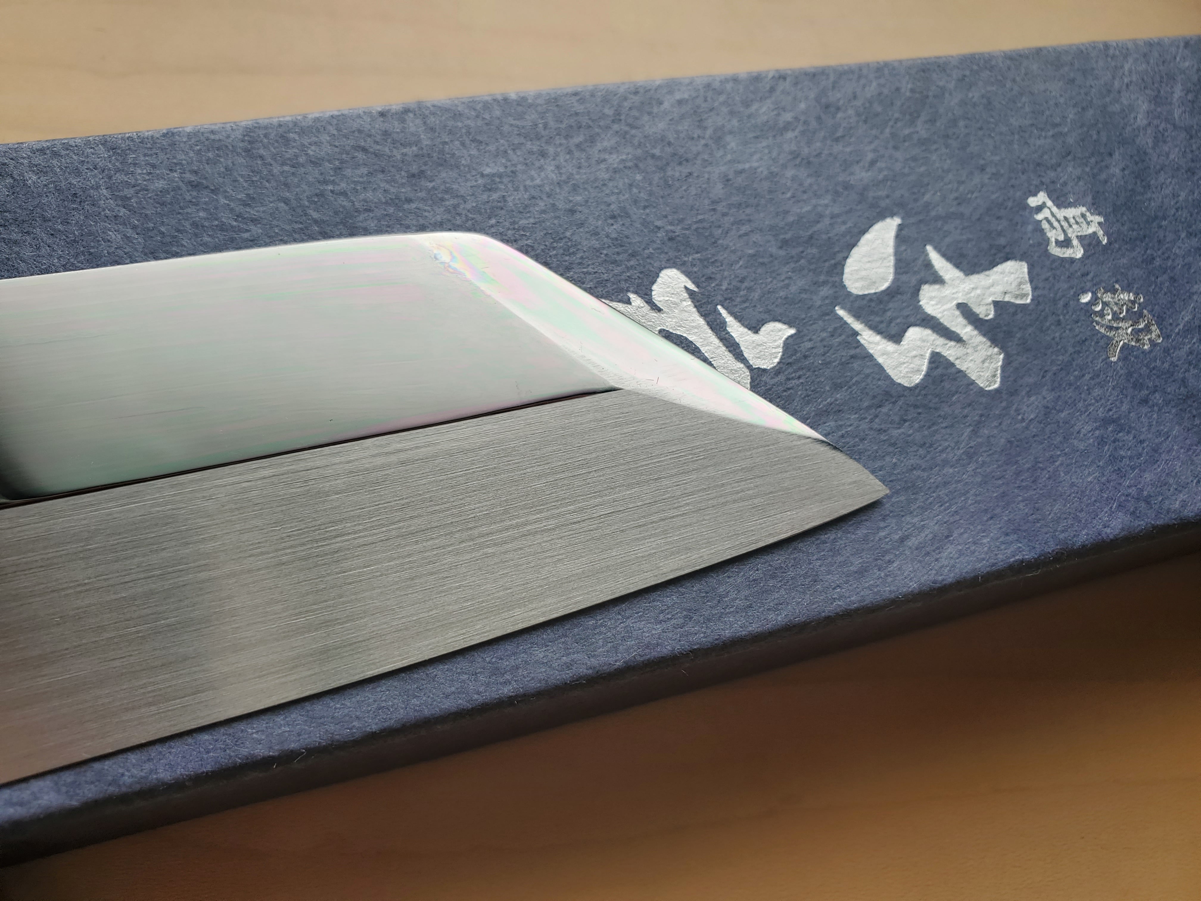 研ぎは堺伝統工芸士(野村祥太郎氏)が手掛けた平鏡面波紋浮かし・切刃手木砥仕上げ・裏サンドブラスター仕立てで、オリジナルブランド「玄祥ノ造」に仕上げております。