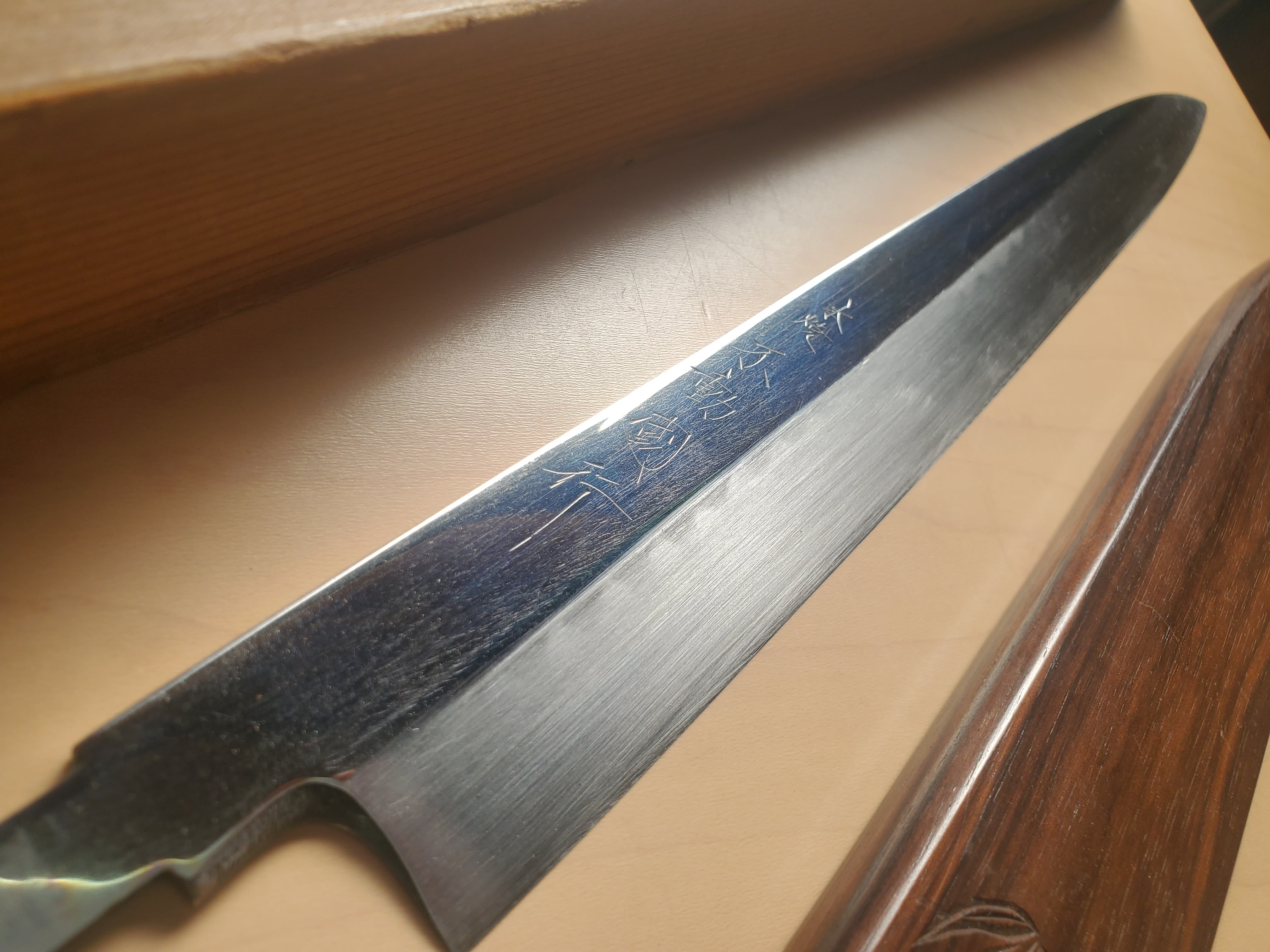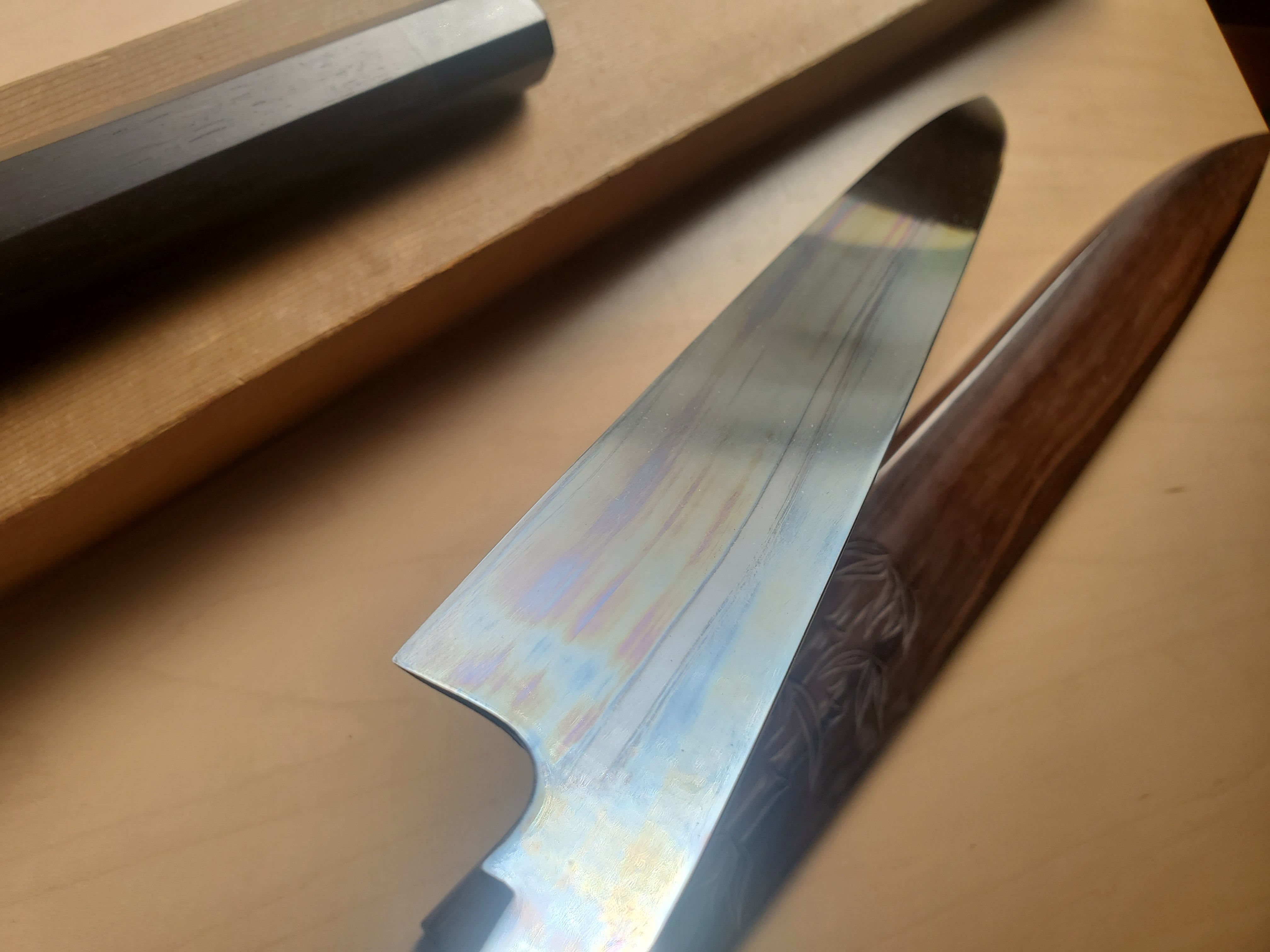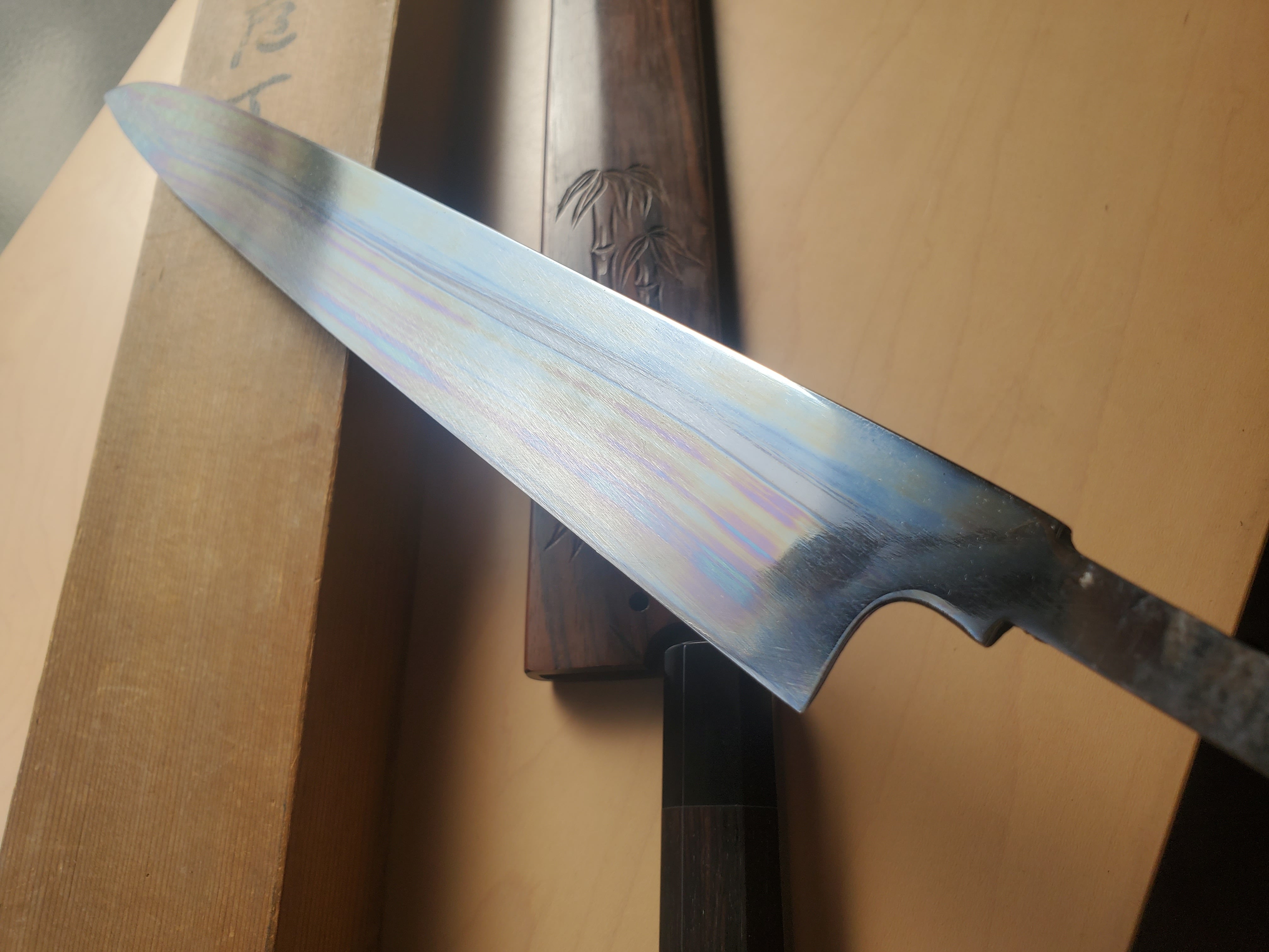 裏は軽い鏡面仕上げとなっており波紋は見え難いですが、切刃にくっきりと玄海さんらしい美しい波紋が見えます。