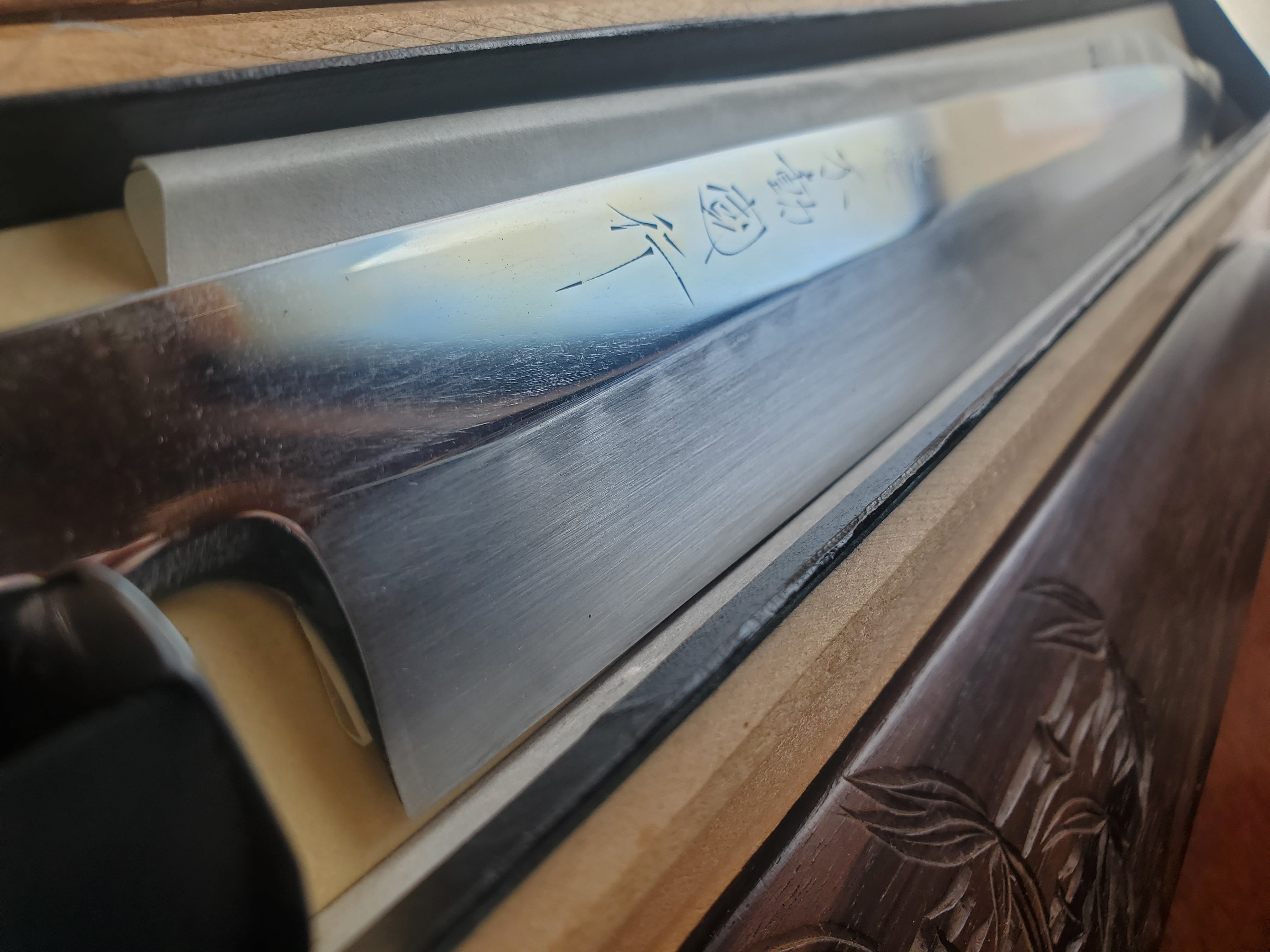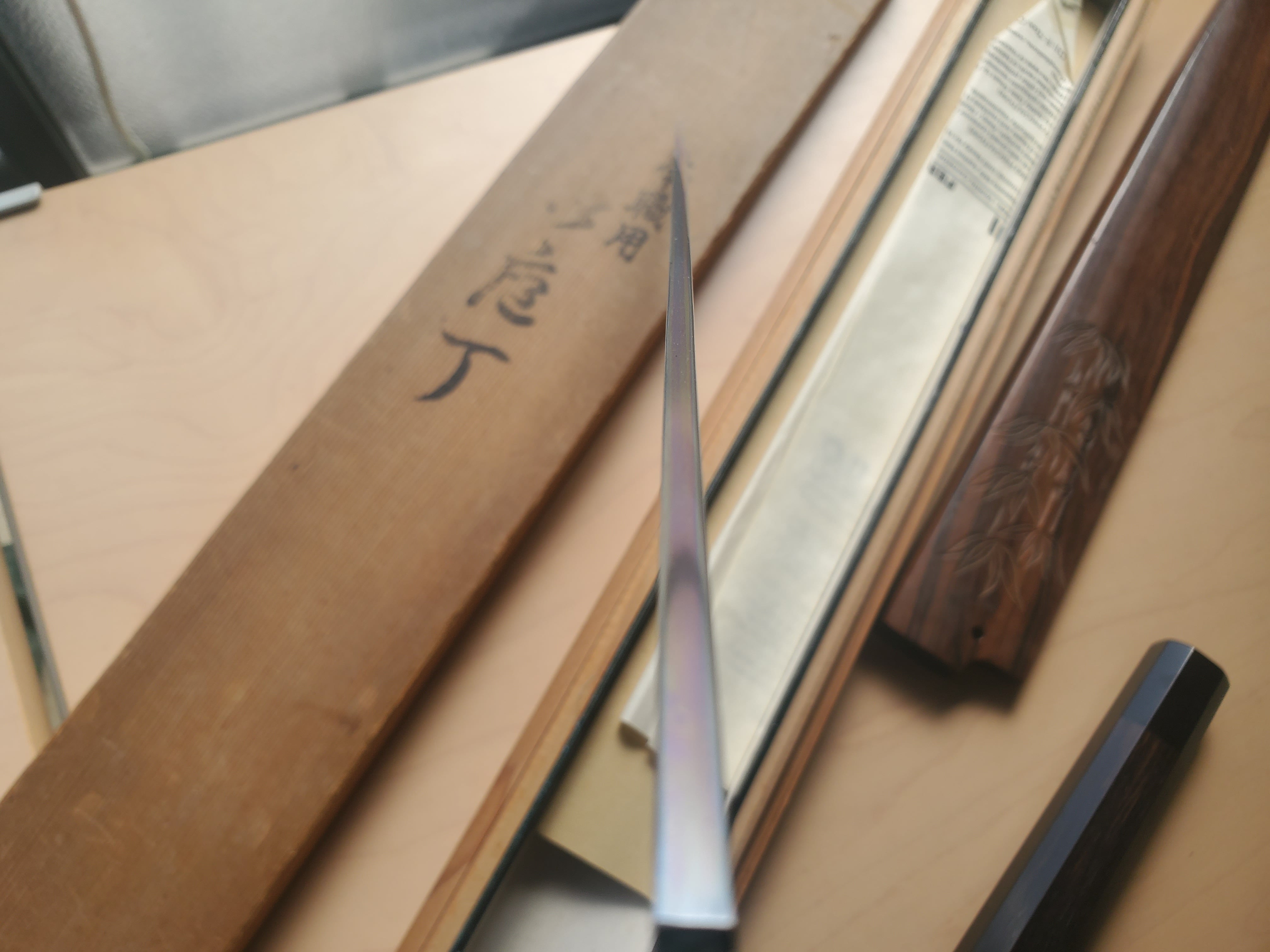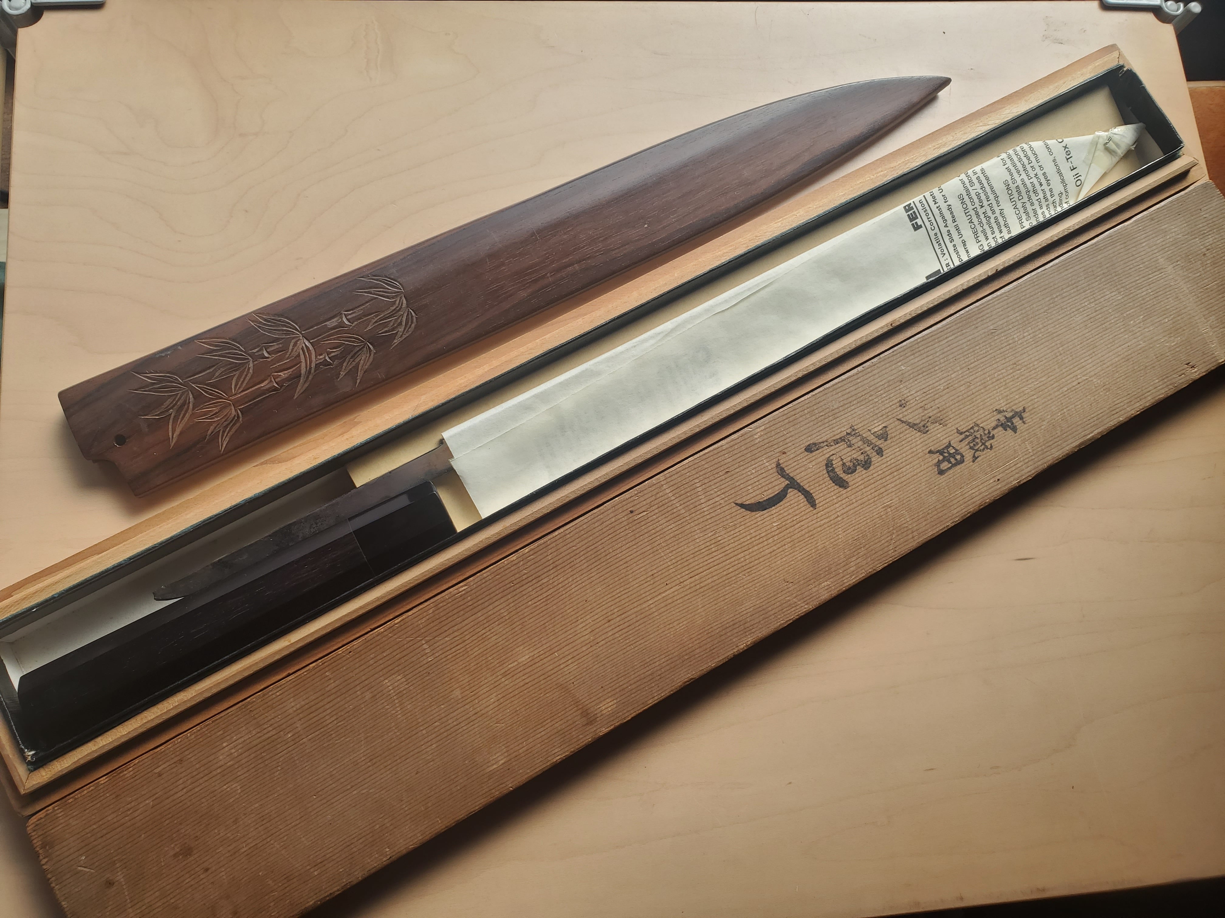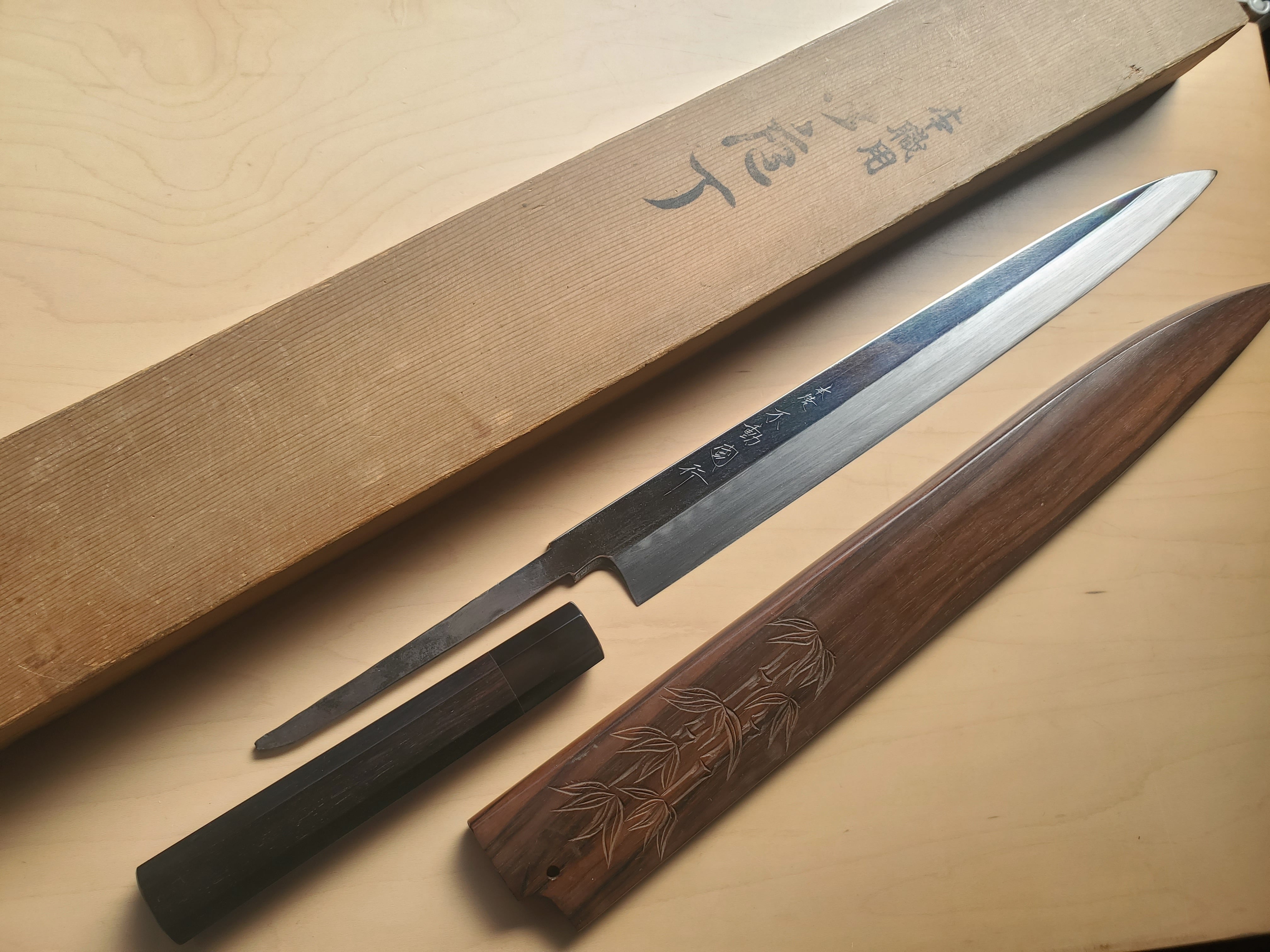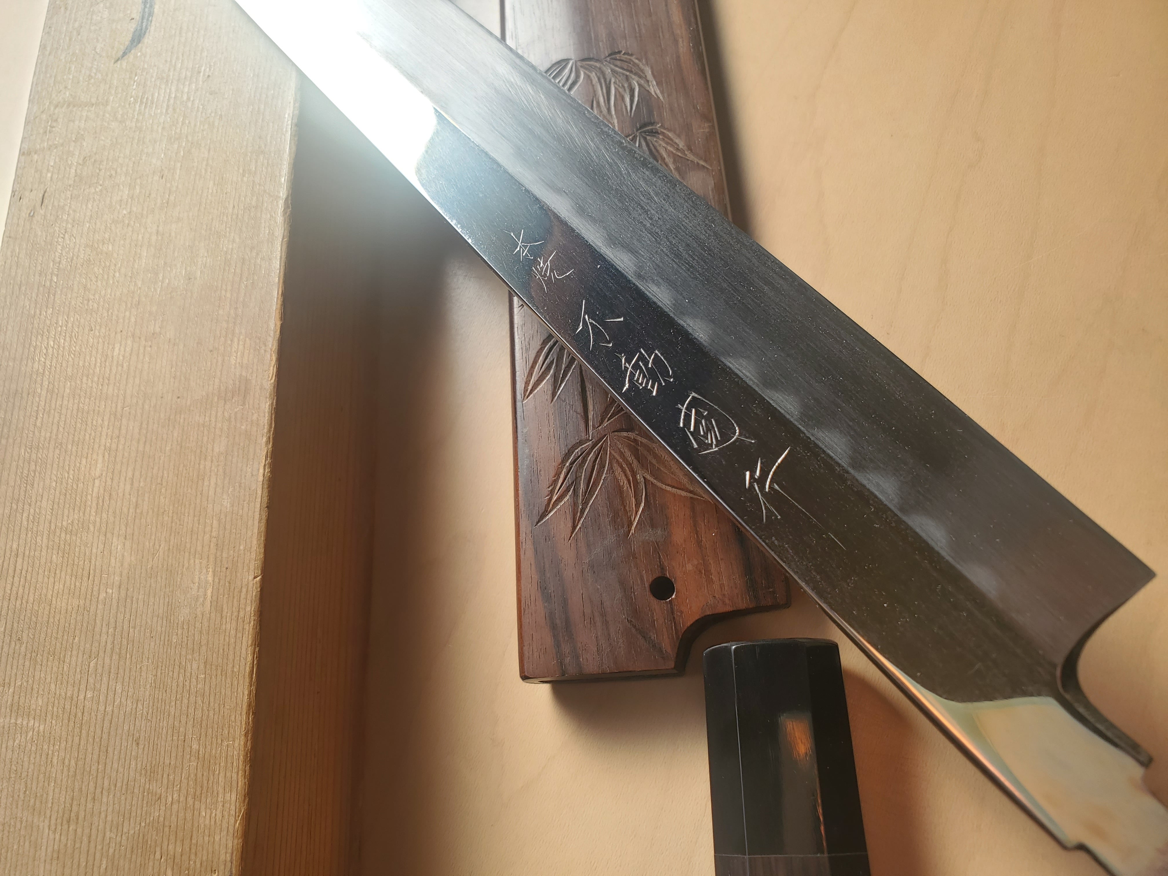 水牛角黒檀八角柄と彫りが入った黒檀鞘、使用感ありますが元箱も付属しております。