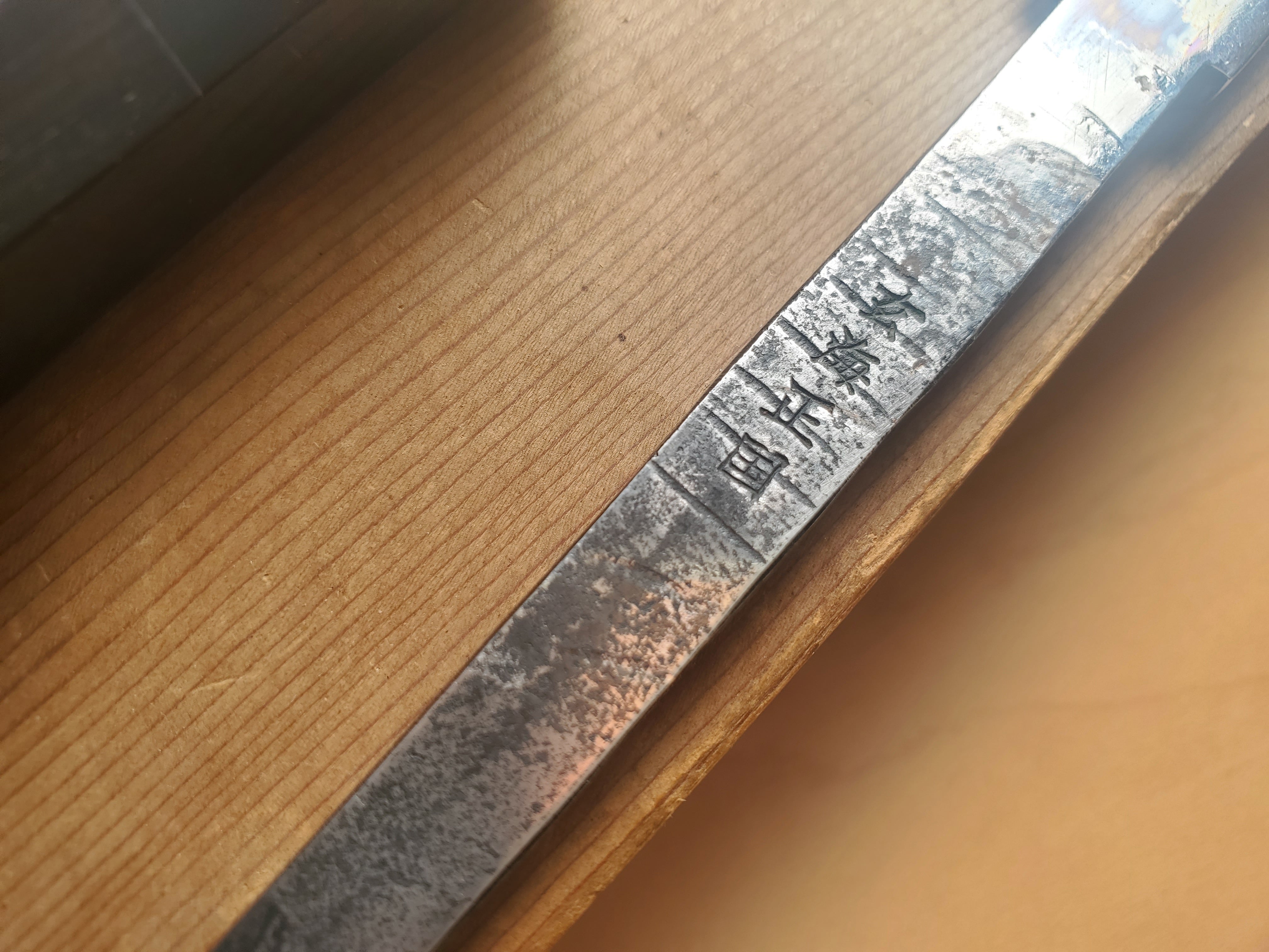現在は中子の銘が確認出来るように柄は取り付けておりませんが柄付けしてお渡し致しますのでご安心ください(不要な場合はコメントよりお伝えください)