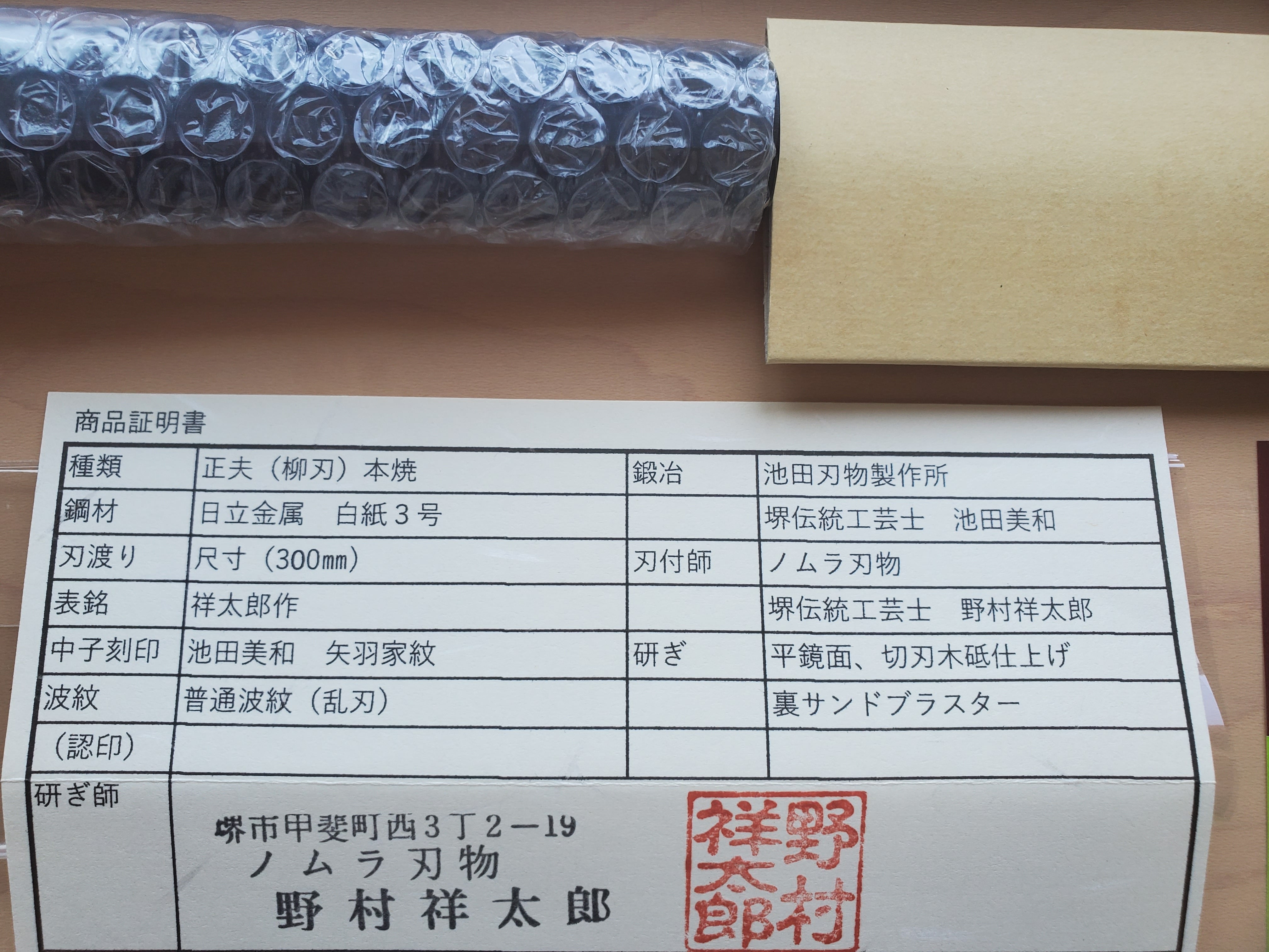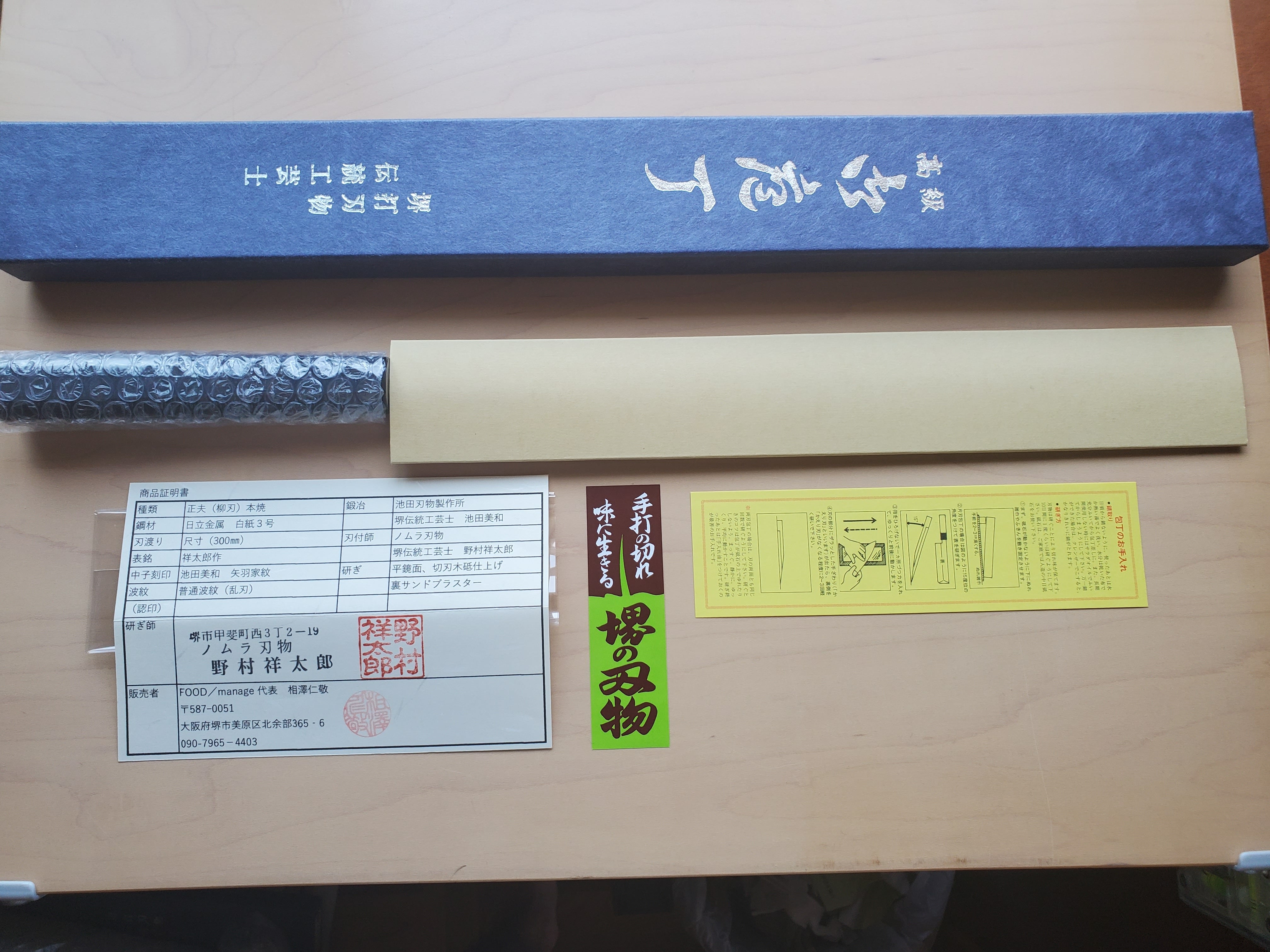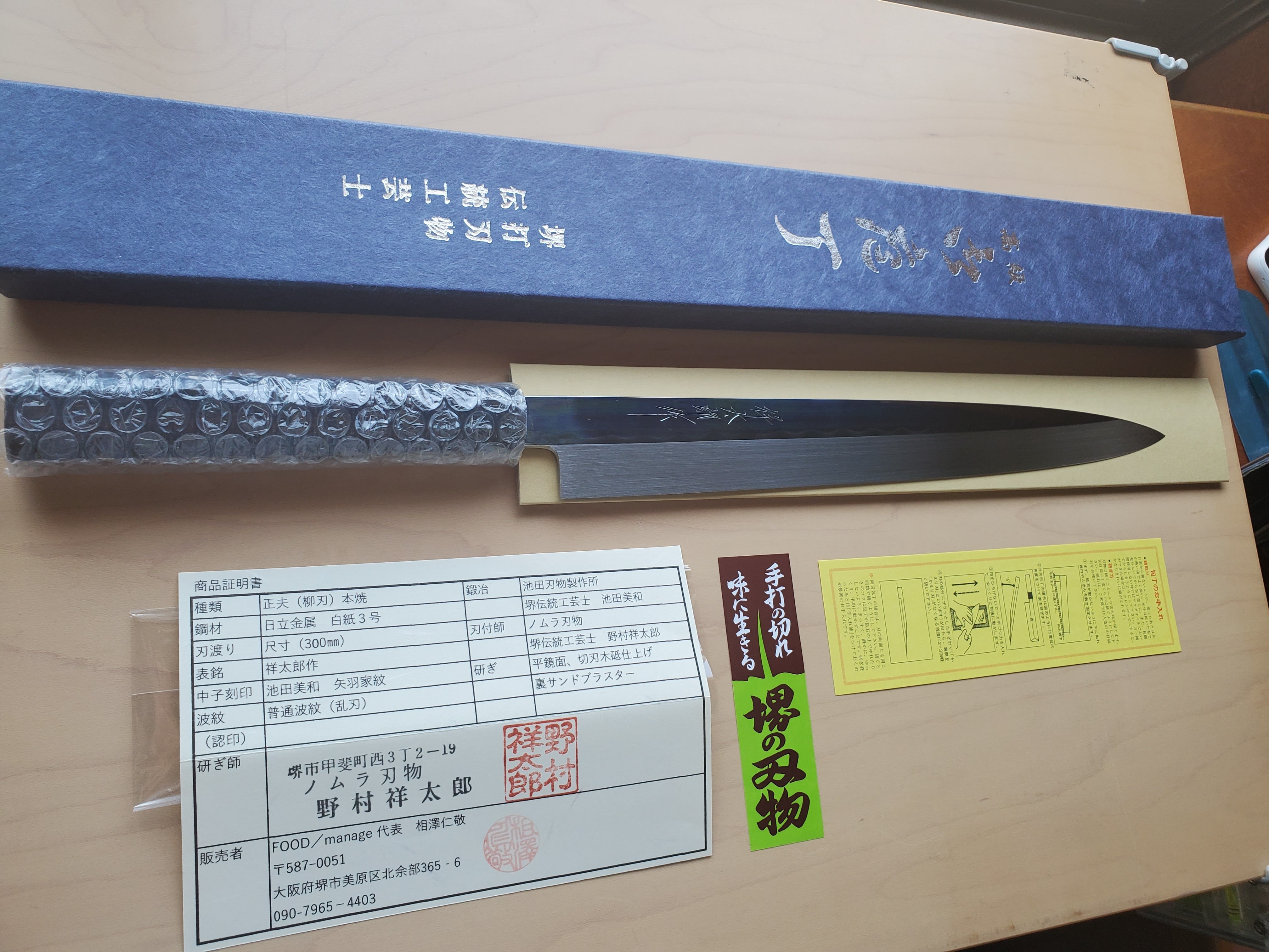 刃渡り30㎝(尺寸)の本焼柳刃包丁で、鍛冶は池田美和氏、研ぎは野村祥太郎氏による職人技が光る逸品で、鋼材は白3、銘は「祥太郎作」波紋も綺麗に出ております。