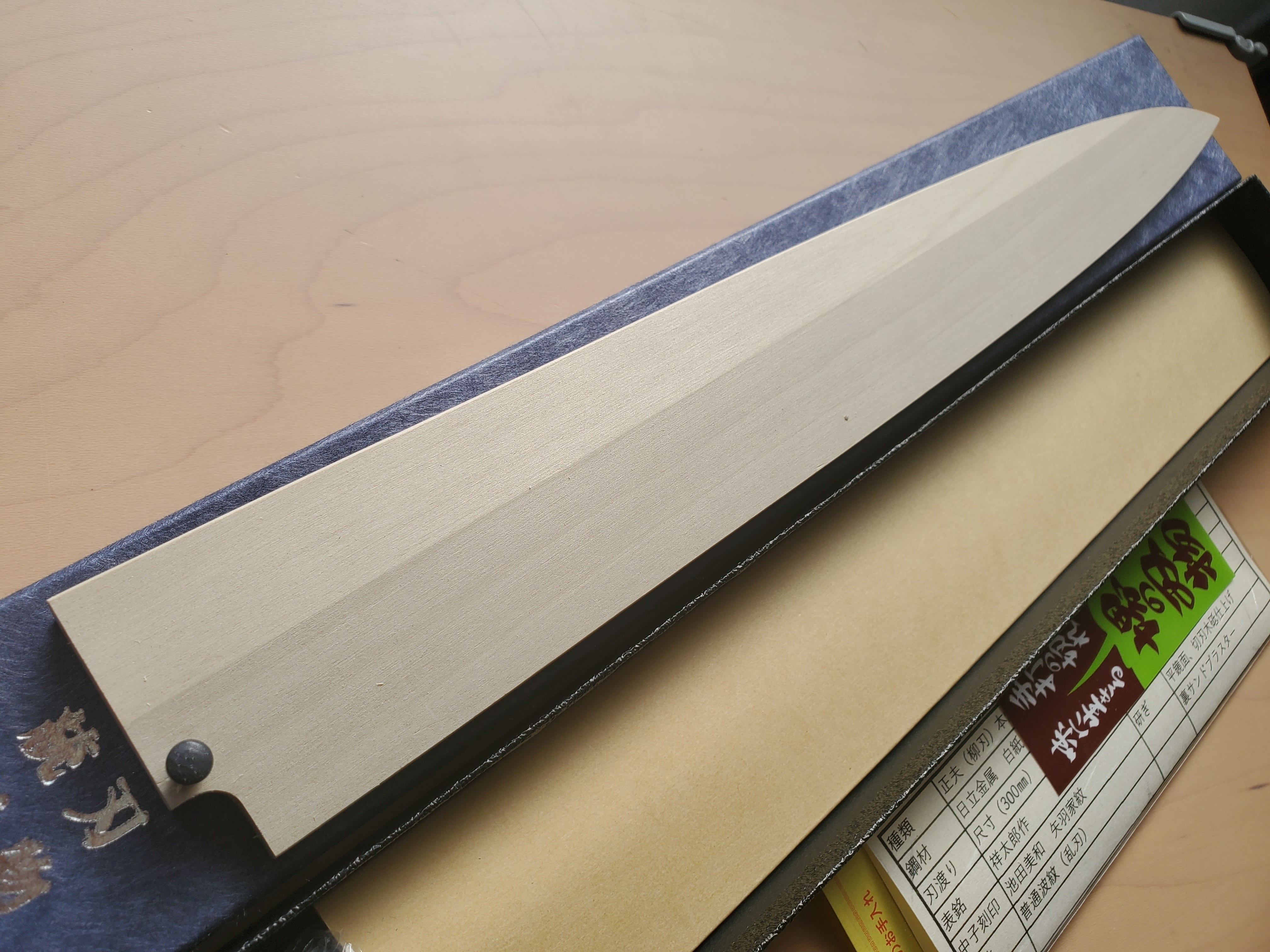 【祥太郎作 本焼】尺 柳刃 白鋼 普通波紋 平鏡面(朴鞘ピン付き)
